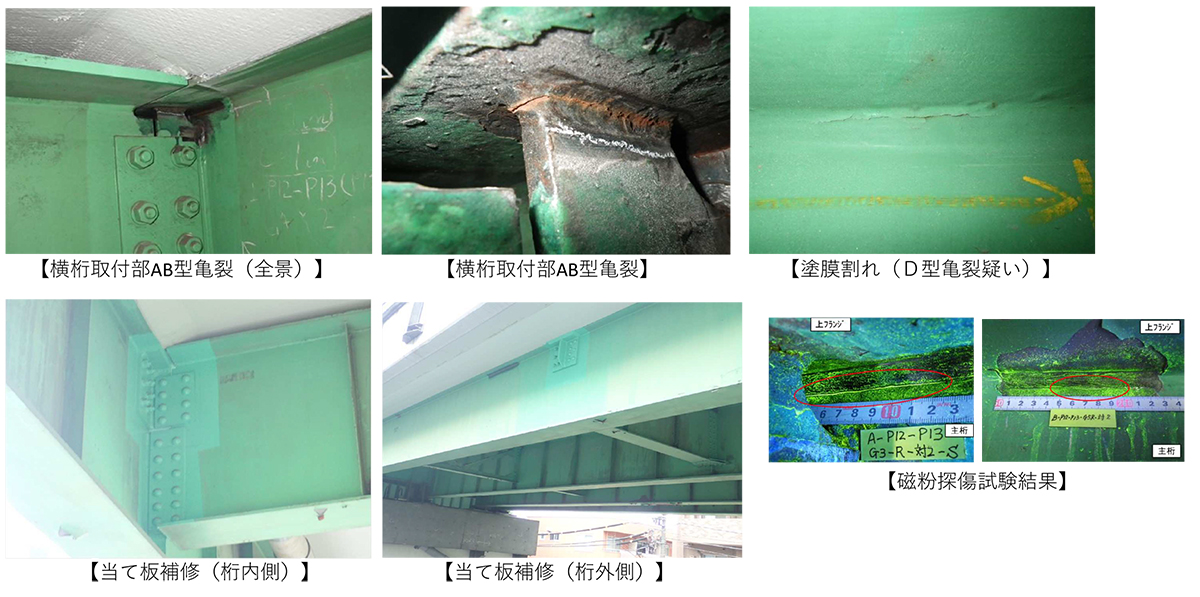 重交通区間の中央道・高井戸IC~調布IC間の高井戸高架橋(上り線/橋長1,296.7m/鋼単純合成鈑桁橋)では、主桁および横桁取付部(溶接部)に長さ19cmにわたり疲労き裂が発生し、当て板補修を行っています。