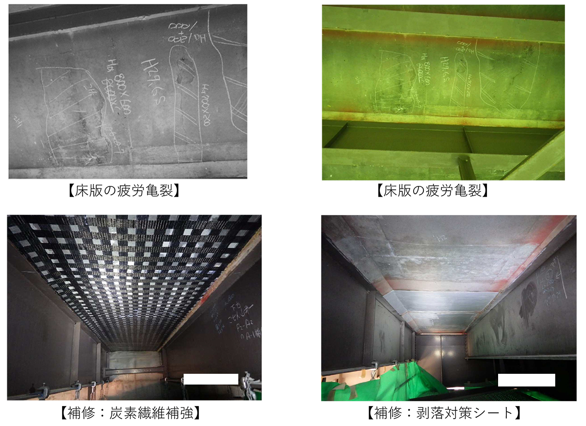 床版の疲労損傷事例としては、中央道(上野原IC~大月IC)の御前山第一橋(下り線・右ルート/橋長138.0m/鋼ランガー橋)で床版下面にひび割れと剥離が発生しました。耐力不足と判定された箇所では炭素繊維補強工を実施し、その他の箇所は剥落対策シートを施工しています。