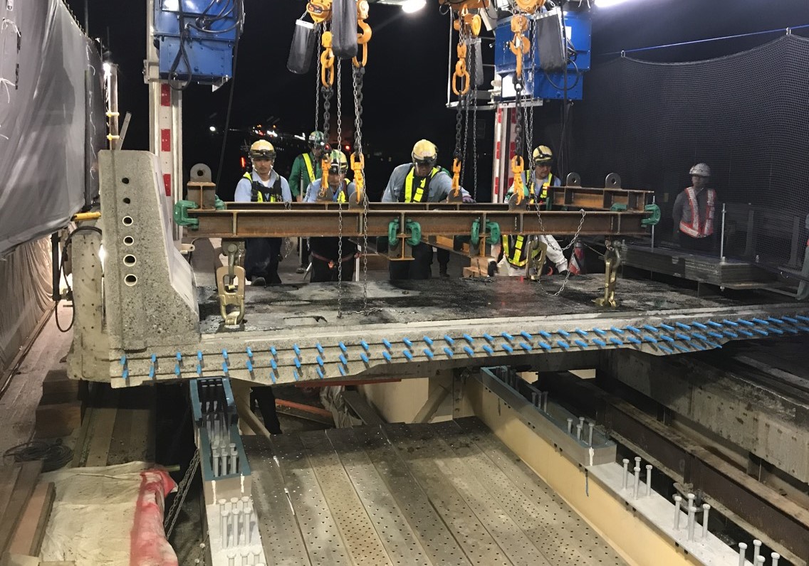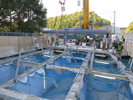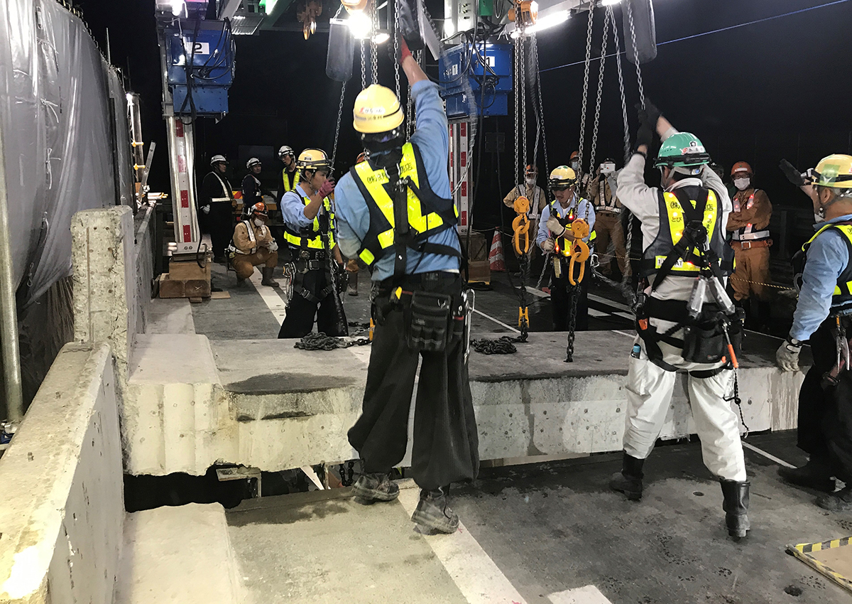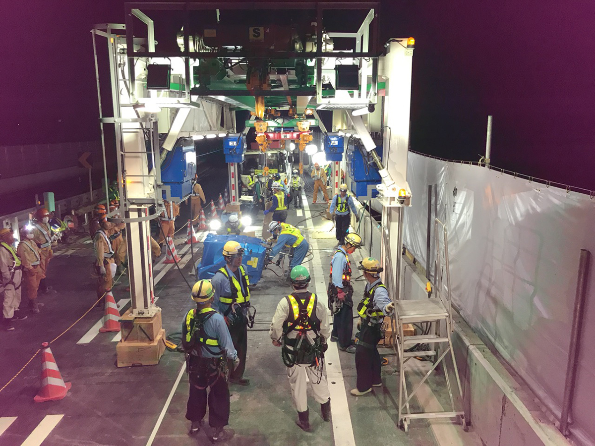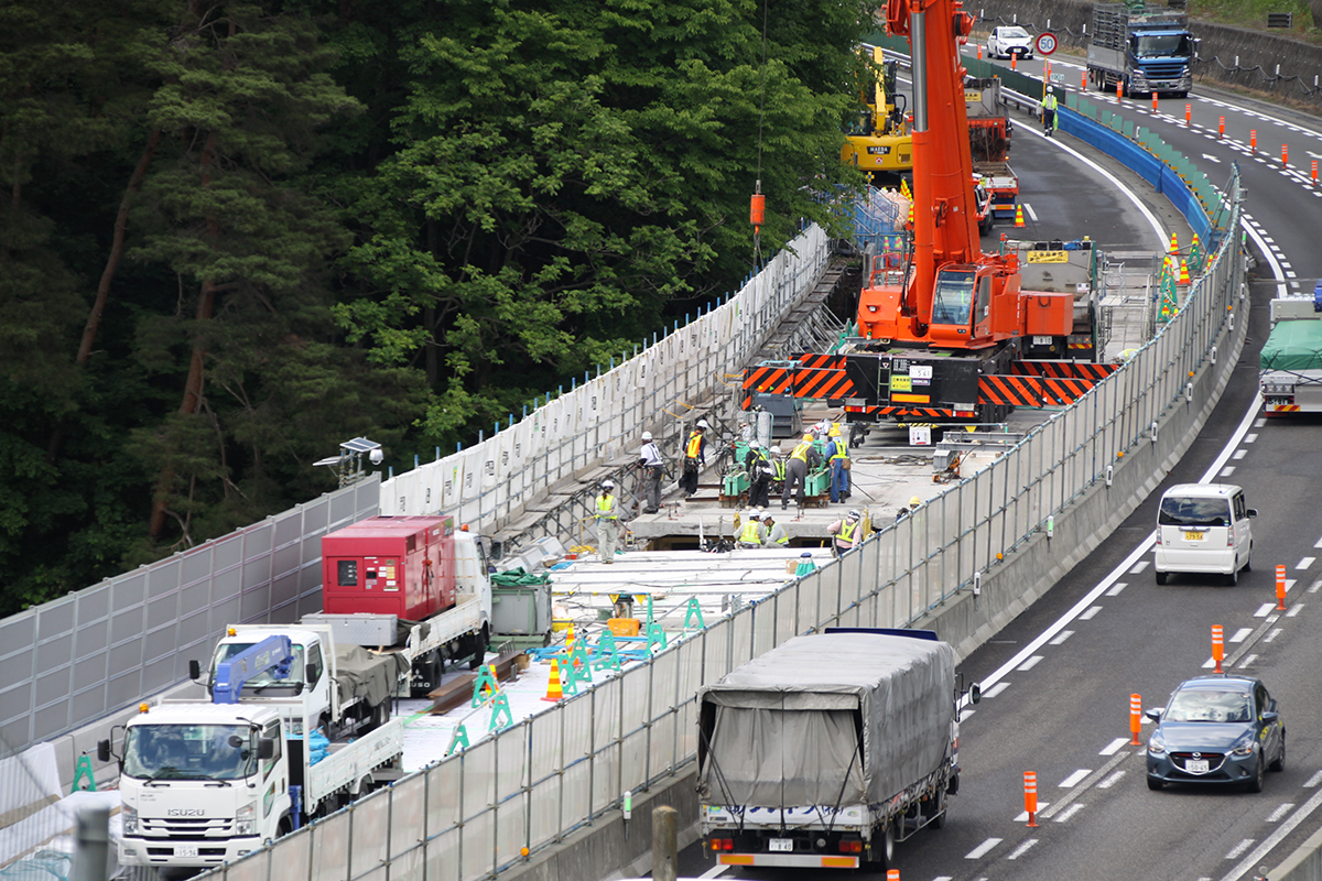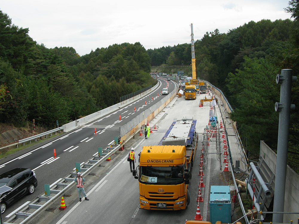 湯川 詳細な結果はまだ公表していませんが、新たな方法である移動式床版架設機と仮設床版が妥当であることは確認されました。また、2車断面を1車断面として工事を進めるわけですから、作業員の方やお客様に対する安全対策は重要課題として考えています。