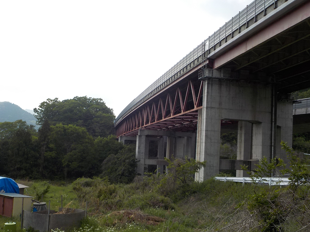 同橋は左右ルートに分かれている箇所にありますので、下り線を通行止めにする必要がなく、あまり交通障害を与えることなく施工ができることは安全面では恵まれた橋梁です。