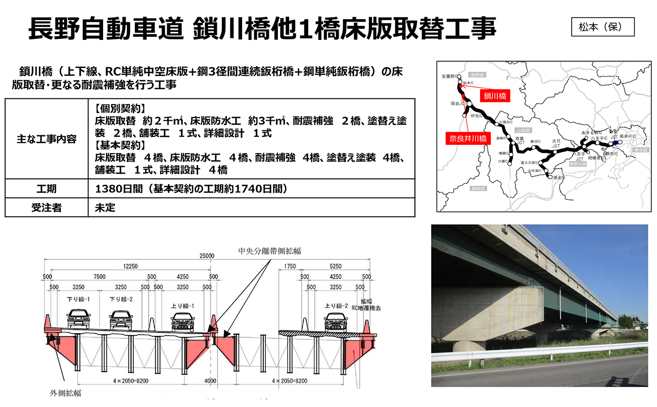 湯川 長野道・鎖川橋他1橋床版取替工事では、鎖川橋(RC単純中空床版+鋼3径間連続鈑桁橋+鋼単純鈑桁橋)で中央分離帯側と路肩側を拡幅して車線幅を確保しながら施工する計画を立てています。