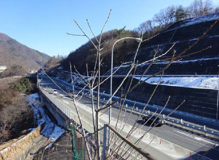 そのほか、2020年度第3四半期公告予定の中央道(大月IC~勝沼IC)の勝沼工事では、祝橋(橋長204m)をFCB盛土(約50,000m3)で土工化することを計画しています。同橋は急峻な斜面に位置する橋梁ですが、下に大きな交差物がなく、土工化が可能です。これにより、工事規制期間を床版撤去時と舗装時だけの期間とすることができるとともに、今後の維持管理でも省力化が図れます。