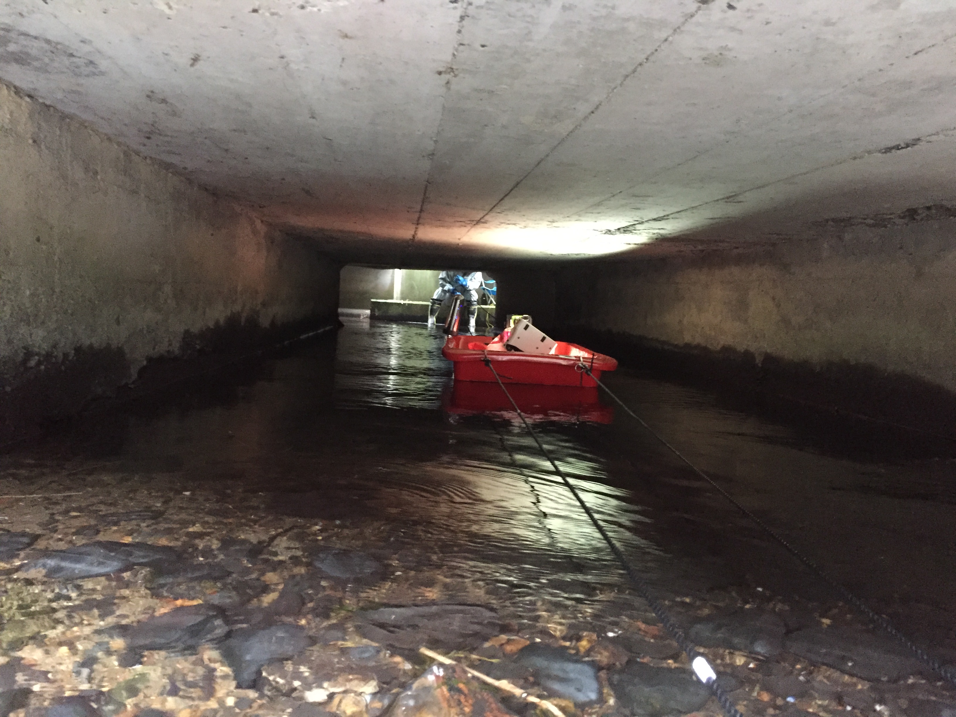 対象となるボックスカルバートは農業水路に敷設されているものです。非常にクリアランスが低くて、延長が短い(7~8m)のですが、なかなか人が入れません。そうしたカルバートの内面調査などで用いるよう開発したものです。インフラメンテナンス国民会議でもたらされたニーズに対して当社がそれを満たすためのシーズ(技術)を提案しました。具体的には非常に小さい船を浮かべて、その上にカメラを積み込んで、ボックスカルバートの裏面全周のコンクリート点検を行いました。