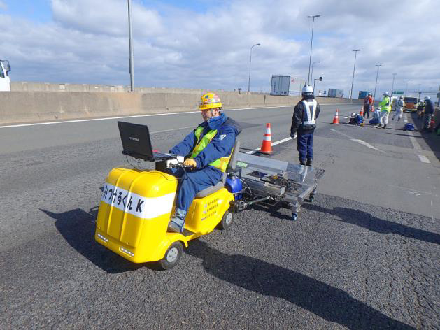 上記のような定常的な点検業務に加えて、特定の変状・損傷の発生や発生要因が明瞭でない事象の発生時における応力・変位・加速度計測を始めとした各種調査計測、大型渦流探傷(みつけるくんK・鋼床版き裂調査、右写真)などの非破壊検査や小型供試体、実物大供試体を用いた載荷実験などを行うとともに、長大橋建設に向けた資料収集や新しい形式の構造、補修方法の効果確認のための調査・試験など、阪神高速グループの一員として各種の課題解決に向けた技術を提供しています。