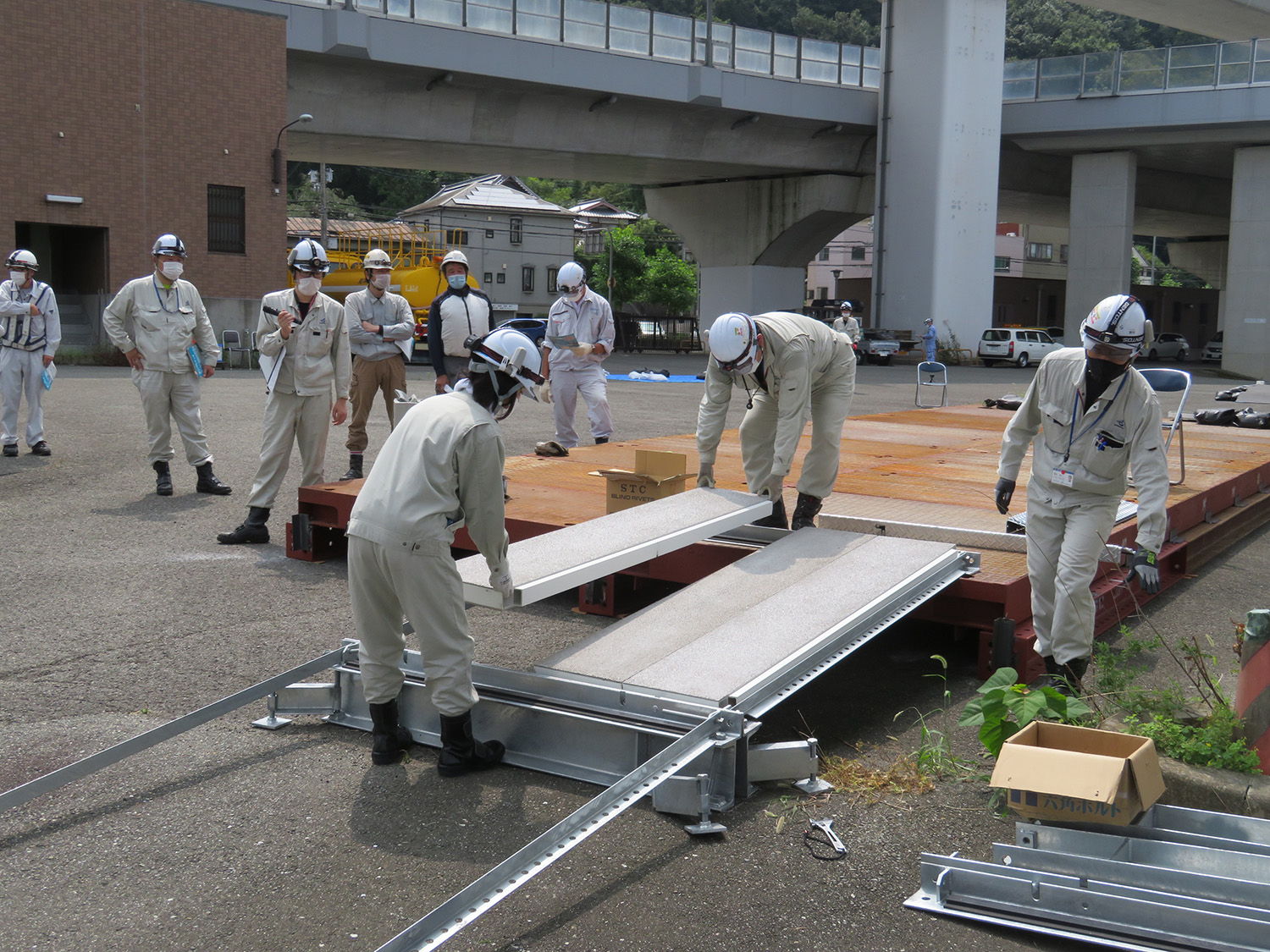 立石 地震が発生した直後、ジョイント部に段差が発生することがままありますが、緊急車両の速やかな通行を確保するため、人力により2人で約6分という短時間組立可能で、長期間の運用ができる段差乗り越え装置『ダンパスデッキ』を宮地エンジニアリングと共同開発しました。4t程度の普通車への適用は確認できており、大型車でも対応できるよう実証試験中です。