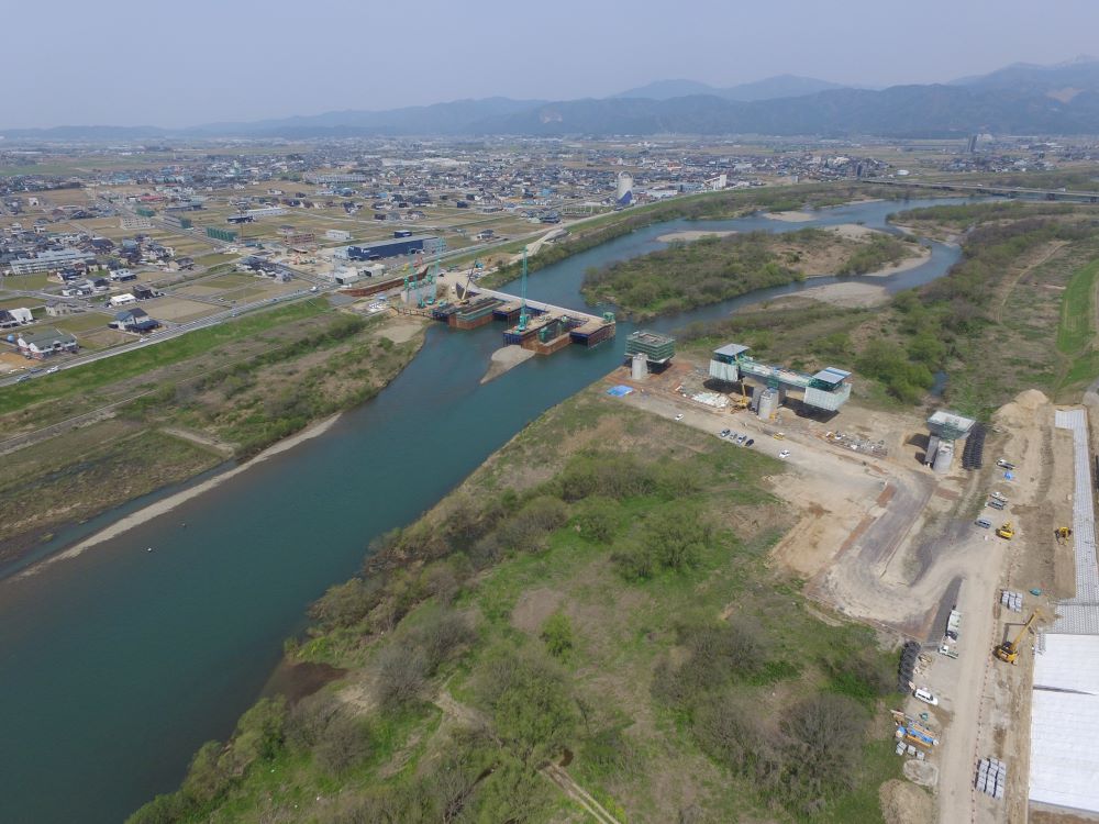 鳥山 九頭竜川はアラレガコの生息地として天然記念物指定されています。そのため、環境に配慮した施工をしています。護床工では、通常ではコンクリートブロックをつなげていきますが、自然石を使った護床工にしています。河川内工事では、通常、瀬替えを行うところを川の環境を変えないために水が流れている箇所には桟橋をつくり、そこから躯体を構築する方法を取りました。