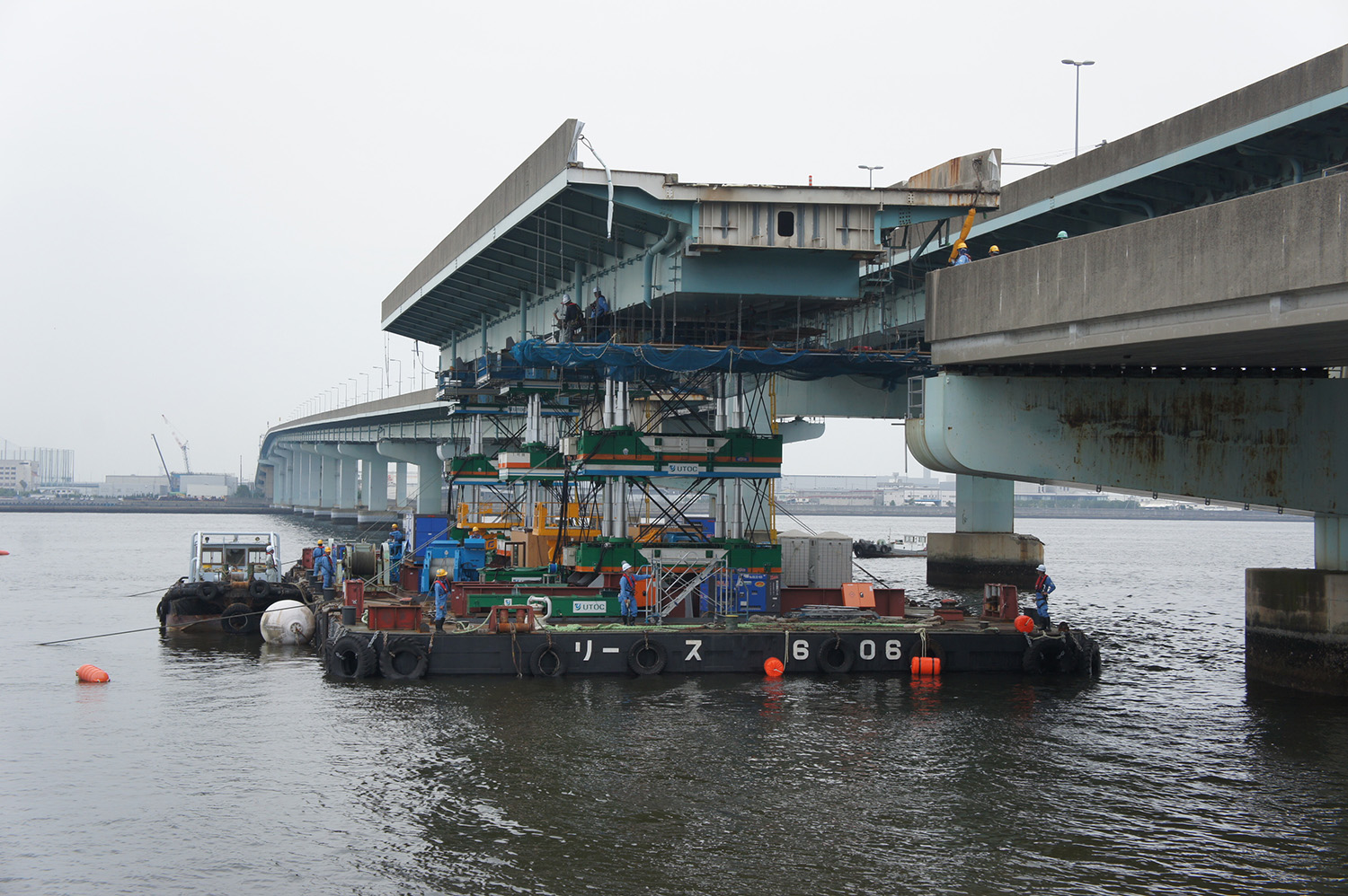 最近では東京都を中心に受注しており、青山墓地の近くに架かる青山橋や、蔵前橋通りやJR総武線などを跨ぐ箇所にある総武陸橋で支承取替などを中心とした長寿命化および耐震補強工事を行っています。総武陸橋では、入社3年目の女性社員が活躍しています。