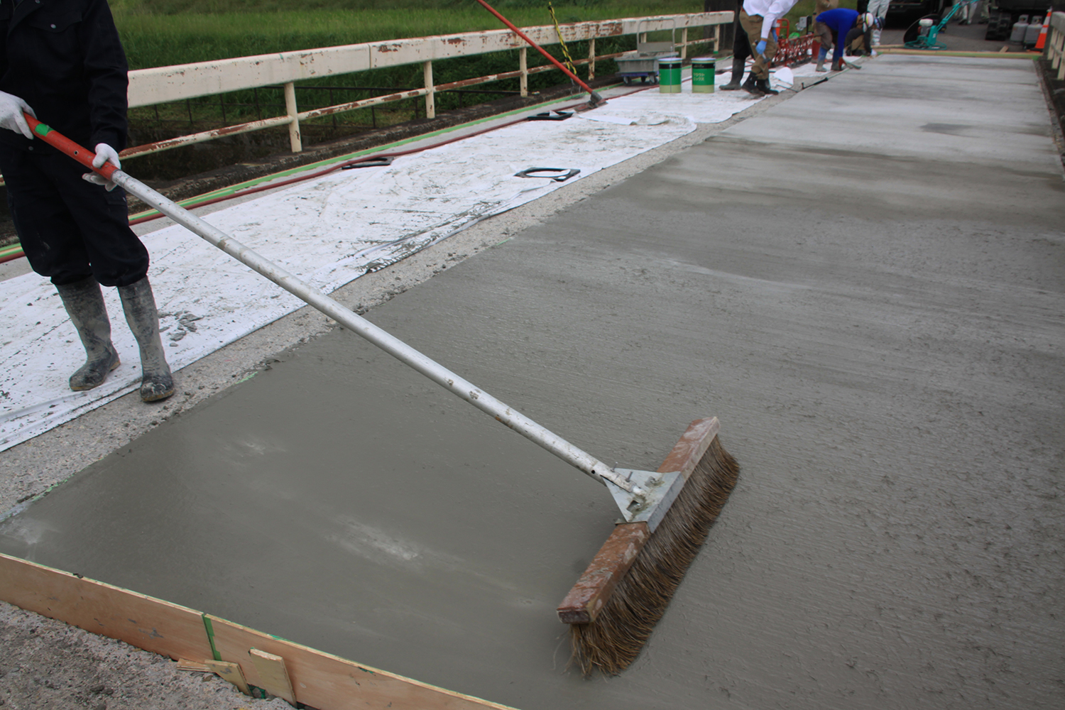 富山市新屋橋での橋面コンクリート舗装(PP混入セメントコンクリート)施工状況(井手迫瑞樹撮影)
