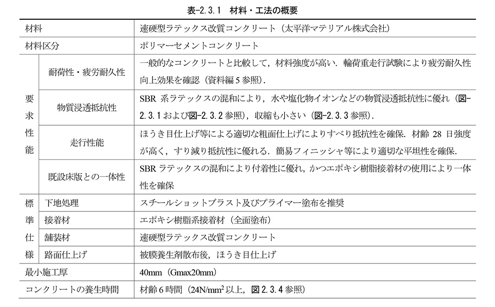 橘 要求性能を満足させることです。設計する時に舗装厚がどれくらいまで許容できるかは確かめる必要があります。それによって適用工法が限られる必要が出てきます。薄くても頑丈なのがJティフコムだし、30mm以上必要なのが、他のセメントコンクリート系などです。工法によって最小厚さが決められているので、それは選定時の大きな制約条件になってきます。