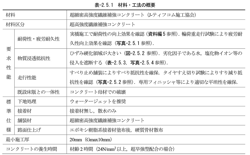 橘 4つあります。1つ目は床版の一部として機能して、床版の耐荷性と耐久性の向上を目指します。2つ目は物質浸透抵抗性です。塩分や水分の浸透を防ぐ性能を求めるもので、米国の基準(本書10P、2-6-1)を目安としています。もし、物質浸透抵抗性が担保できないのであれば、床版とコンクリート舗装との間にそうした物質を遮断することができ、付着性能も補強できる接着剤を界面に塗布することを推奨しています。