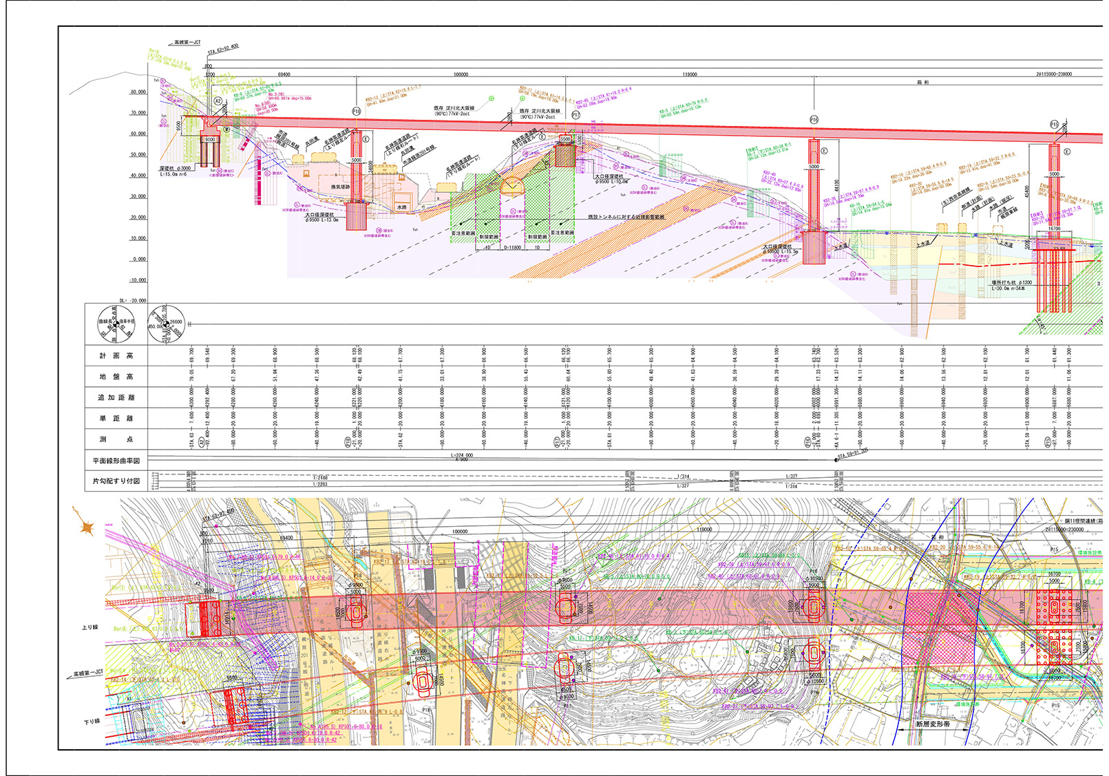東側から国道171号(国土交通省)、東海道新幹線(JR東海)、阪急京都線、さらにはJR京都線(JR西日本)、名神高速(梶原トンネル南側坑口付近)の上下線左右4ルートの上空を横架します。さらに山に突入し、1.3kmのトンネルを抜けた後、今度は約3年前に開通した新名神神戸~高槻間の新名神の本線上を横架して、神戸までつながる新名神にドッキングします。さらに近隣には、関西電力送配電変電所があることから、多数の鉄塔および高圧線が存在しており、新名神建設の支障となるため、鉄塔などの移設が必要となるなど、重要なインフラが密集する箇所を通過するルートであるため、4.4kmと延長的には僅かですが、お客様を抱える様々な事業者との協議が必要になる区間と言えます。