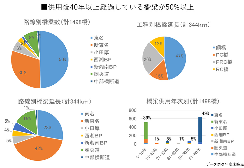 東名はRC床版や鋼部材の疲労、小田原厚木道路は塩害など