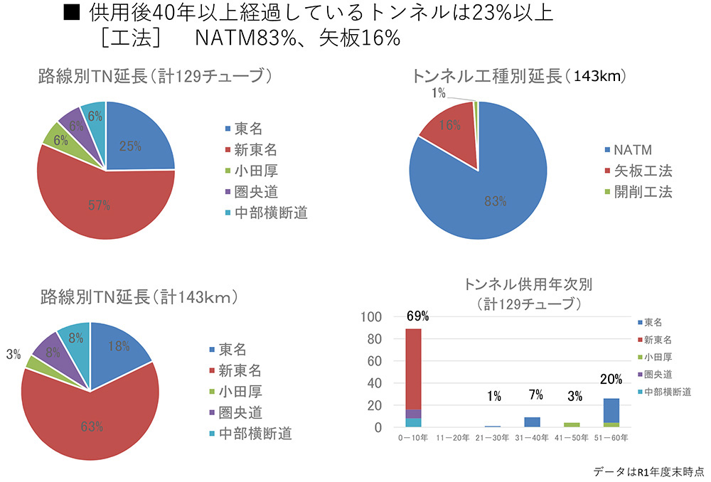 40年以上経過しているトンネルは24%で、東名はそのうち7割を占めています。工法別では、NATMが83%、矢板工法が16%。トンネル延長は、新東名が63%を占めます。工法ではNATMが多くなっていますが、東名および小田原厚木道路は矢板工法により施工されたトンネルが多く、老朽化が進んでいます。