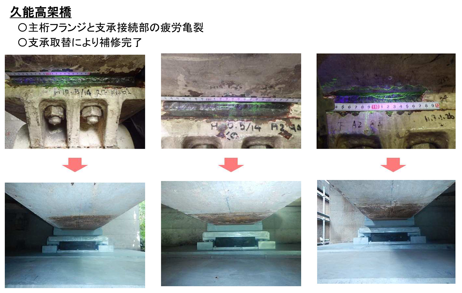 浦 伸縮装置などの橋梁付属物や桁端の損傷が多く見られます。西湘バイパスでは、飛来塩分による影響で、桁のフランジが腐食して桁補強をしなければならないものもありました。具体的な事例として、東名の久能高架橋において、主桁フランジと支承接続部にき裂があり、支承取替を実施します。