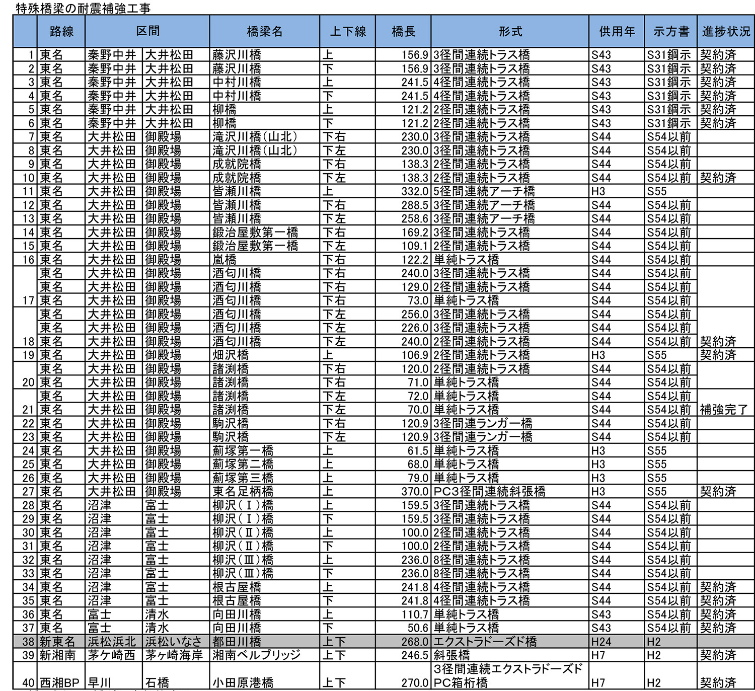 浦 現在行っているのは特殊橋梁全体系の補強ではなく、地震が起きても橋梁が機能を速やかに回復できるための支承交換や逸脱工事などが対象です。橋脚については、東名は完了しています。