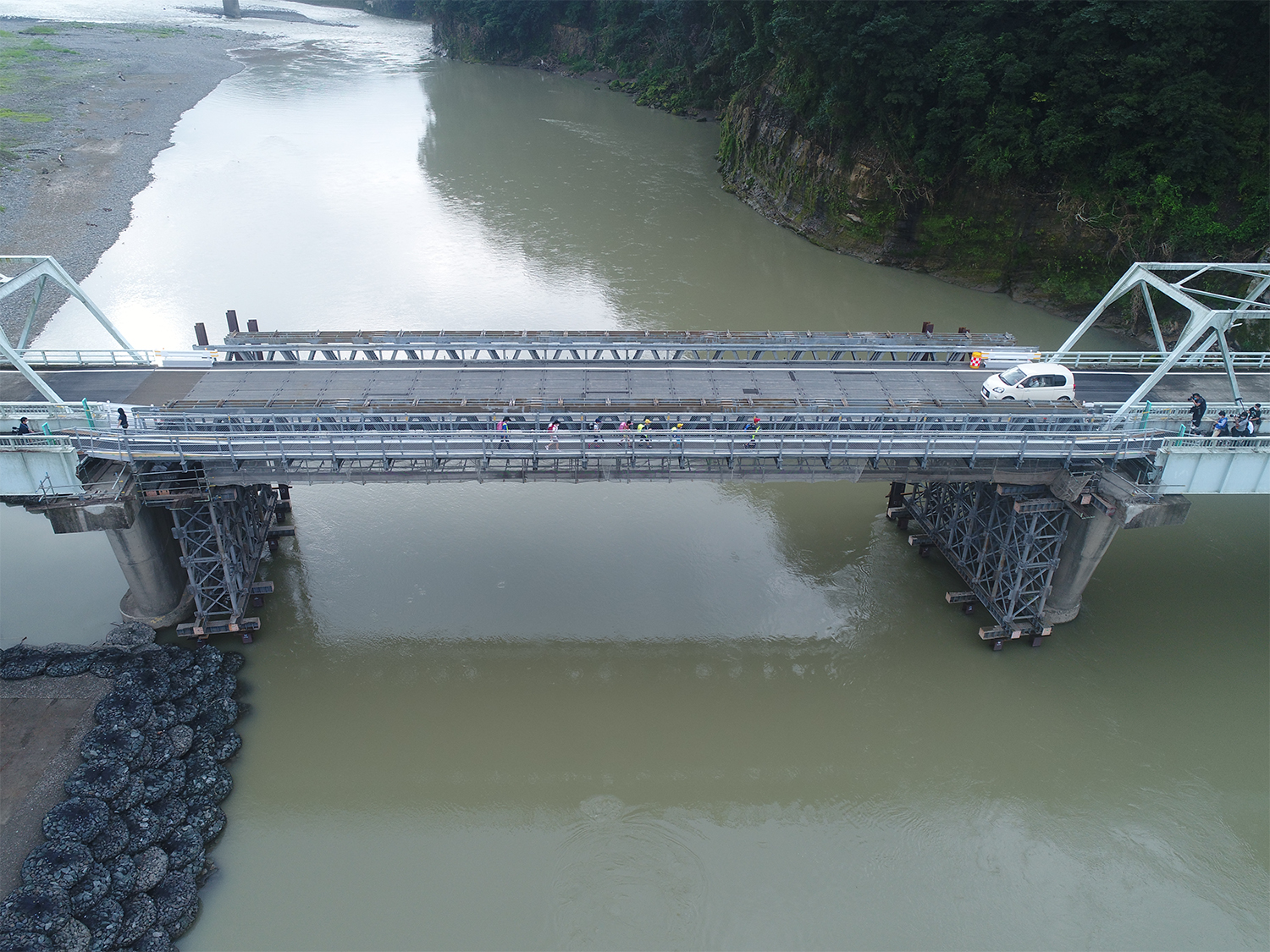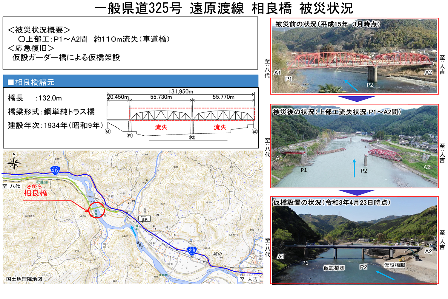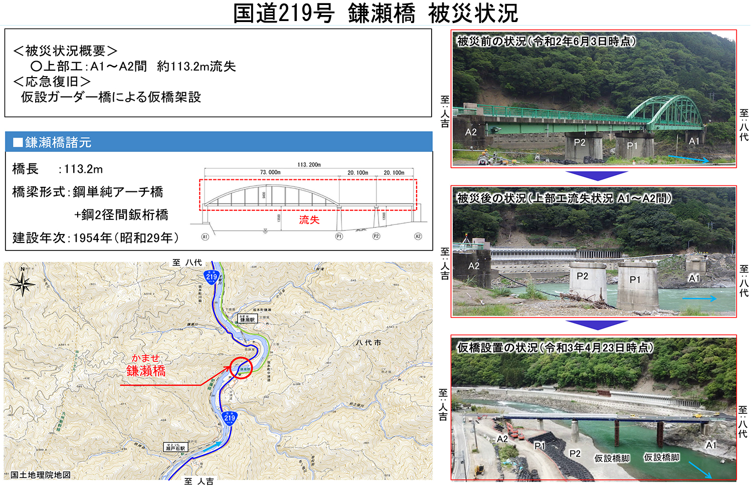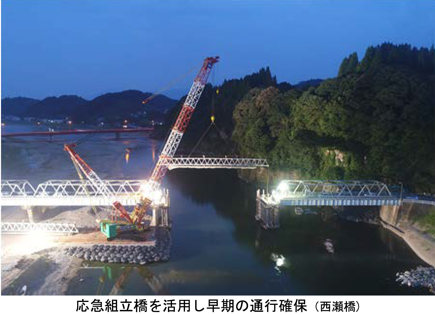 10橋流された橋のうち、基礎に影響を受けておらず、両側に集落があるようなところは、仮橋を付けて早く渡れるようにしようということで、西瀬橋は基礎の被害が軽微であったということと、同橋が小学校の通学路であり、この橋を使うルートでなければ、子供たちを大きく迂回させなければいけなかったので、整備局が保有していた応急組立橋を持って行くことで、9月4日には仮復旧しました。現在は国道219号と対岸の県道や村道の応急復旧、加えて渡河する橋梁が一定距離以上ないと、大きく不便が生じてしまうことから、西瀬橋と同じように基礎や橋脚がしっかりしていて、両岸に集落があるようなところ、鎌瀬橋と相良橋、坂本橋の3橋については仮橋をかけて仮復旧しました。