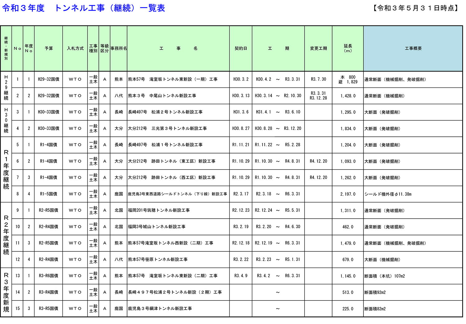 同様に施工中ないし発注予定の100m以上のトンネルは15本です。最長は滝室坂トンネルです。
