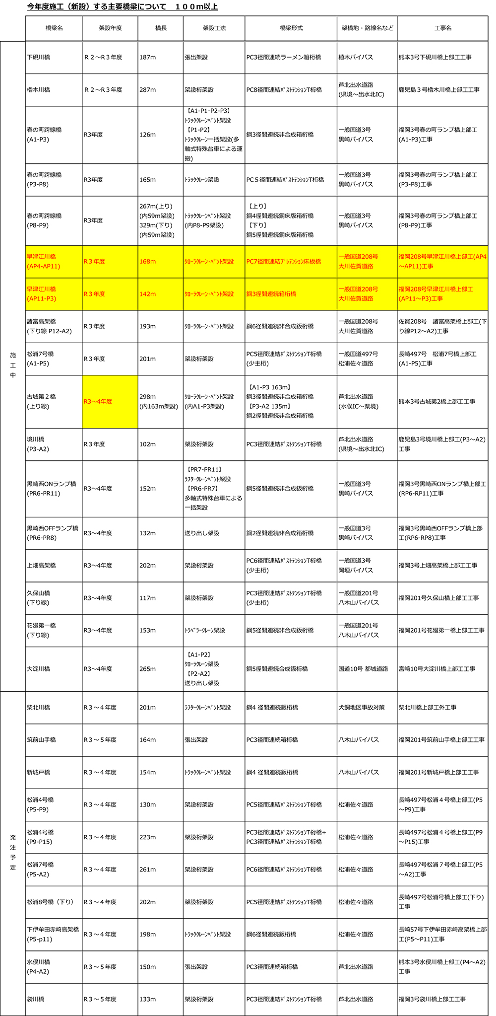 沓掛 今年度上部工を施工あるいは発注する100m以上の長大橋は27橋あります。施工中あるいは発注予定の橋梁で最長は国道3号古城第2橋の298mです。