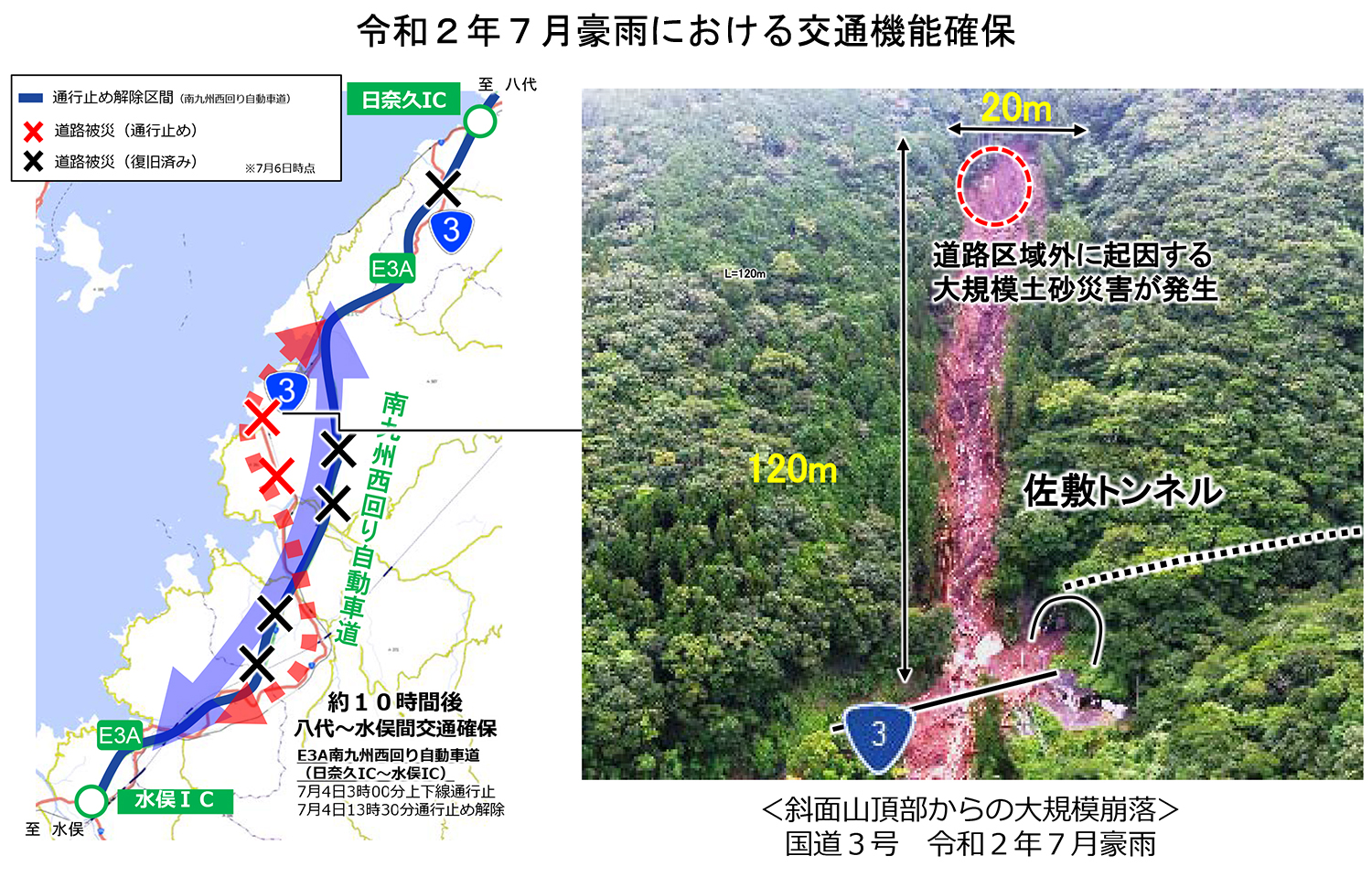 今次の水害は様々な教訓を含んでいます。一つは並行して4車線区間(高速道路)があったため助かったということです。球磨川の方でいうと、九州縦貫道も上り線に浸水が起きましたが、それでも2車線中1車線は使用できる状態で、10時間後には緊急車両を通すようにしました。玖珠川の方では大分自動車道も被災しましたが、これも4車線あった関係で、片側2車線を対面通行にして被災地のう回路として使うことができました。ダブルネットワークおよび4車線の大切さというのは非常に大きいと考えています。