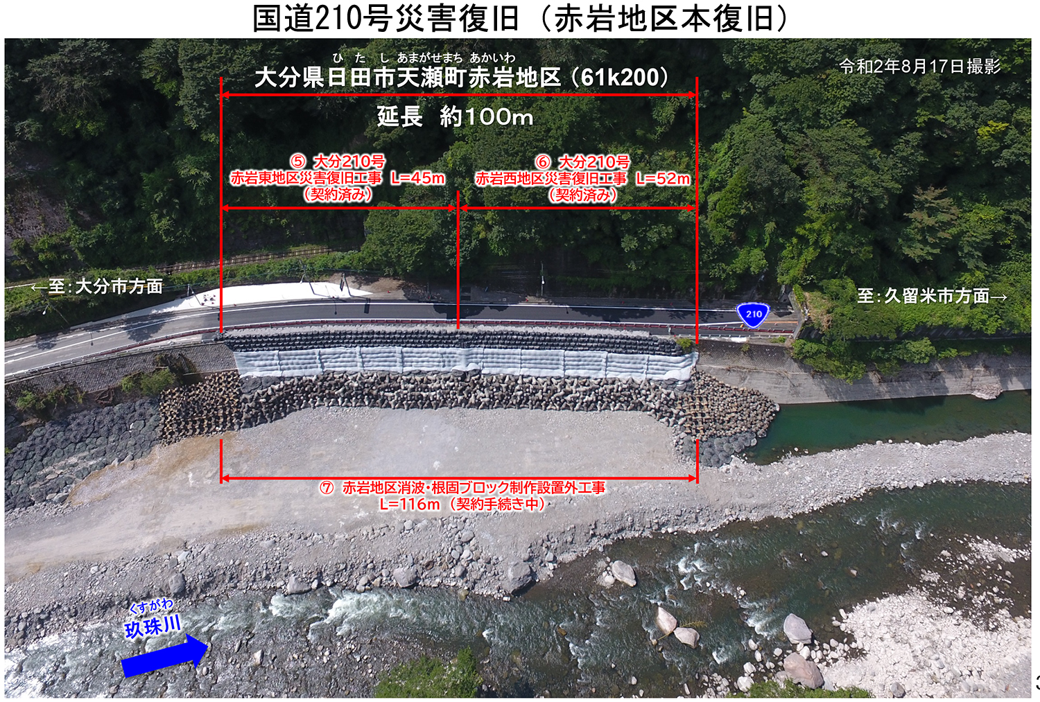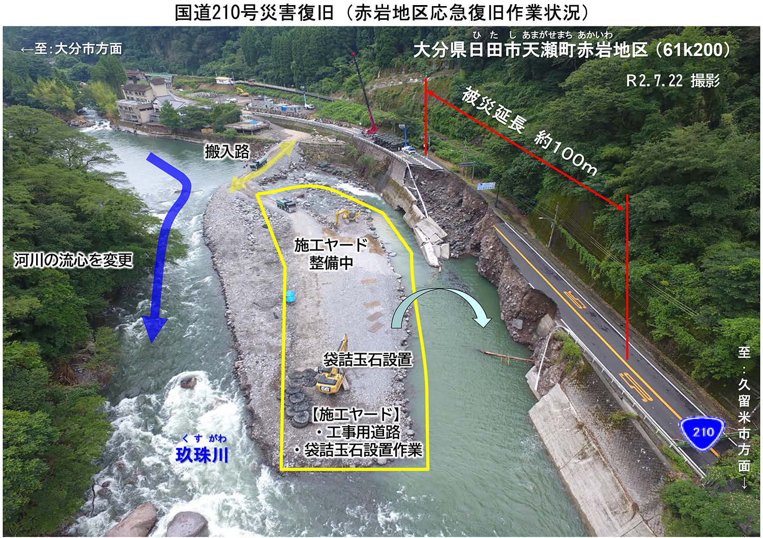 沓掛 天瀬温泉地区の道路は、国交省は権限代行を行っておりませんが、むしろ直轄道路が大きな被害を受けており、国道210号全体で57個所が被災し、延長50㎞で通行止めなどを余儀なくされました。中でも一番ひどかったのは、日田市天瀬町赤岩で、100m以上にわたり護岸が崩壊し、道路が流されてしまいました。玖珠川が蛇行している個所にあたるのですが、水位上昇による水衝突によって100m以上が流失しました。同じことが起きないようにするため41日間で瀬分けを造って、応急復旧しました。現在は本復旧のための発注を行っています。先ほど話したように仮復旧部を埋め殺す形で施工できないか検討しています。