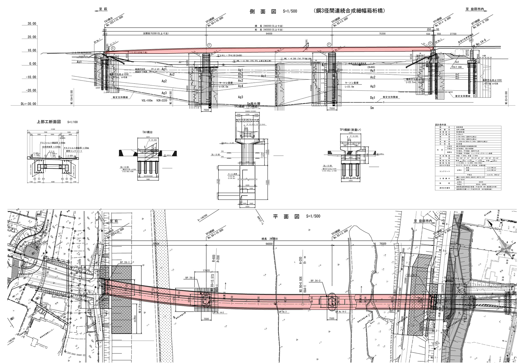 角 橋長246mの鋼3径間連続合成細幅箱桁橋となります。下部工は、左岸側がTA1橋台で場所打ち杭の逆T式橋台、橋脚は張出式橋脚で右岸側のTP1橋脚が場所打ち杭、TP2・TP3橋脚がニューマチックケーソン基礎です。