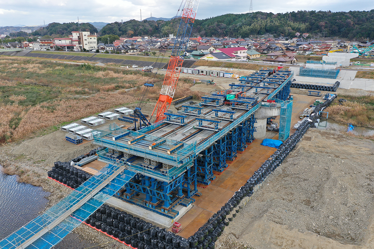 ひとまろ大橋 河川部は作業構台を構築して送出しで架設