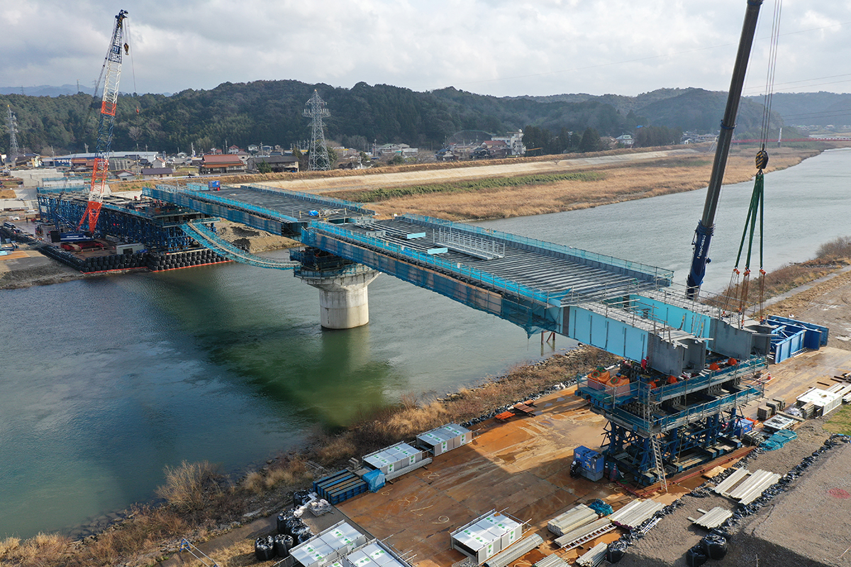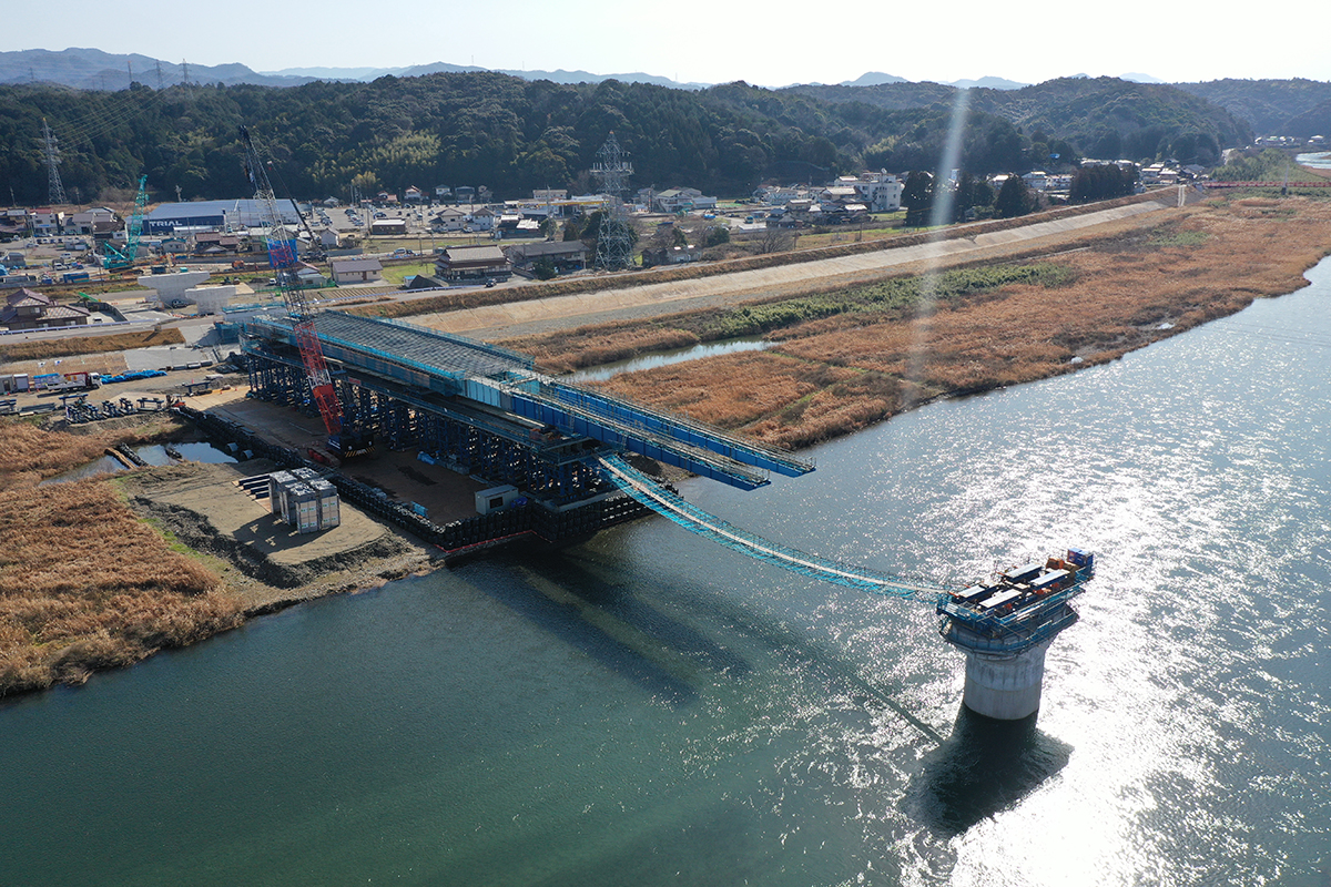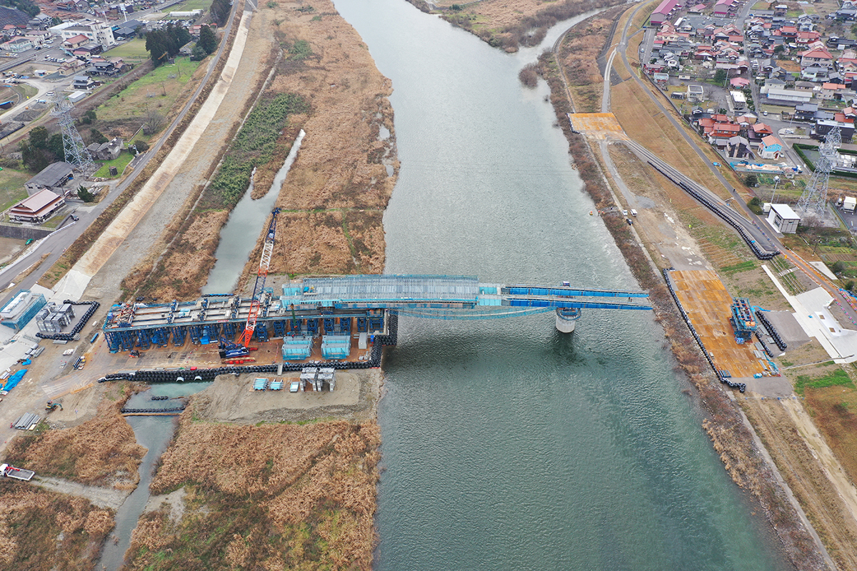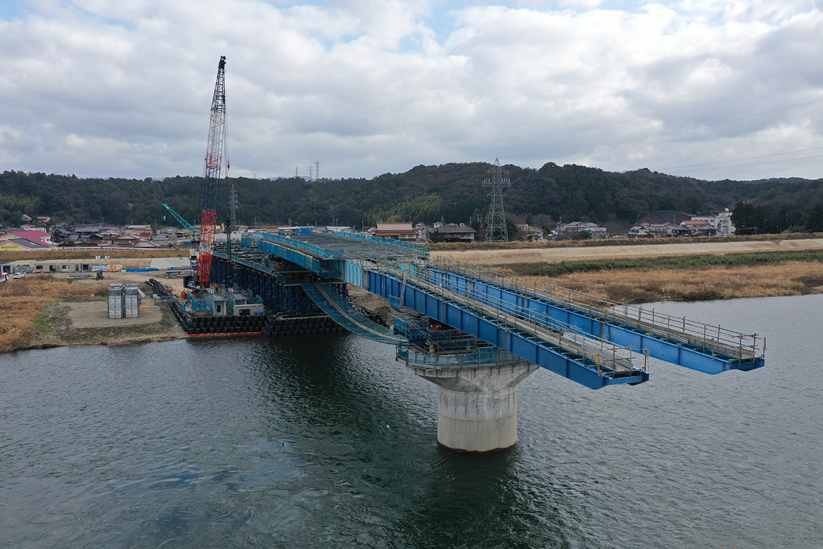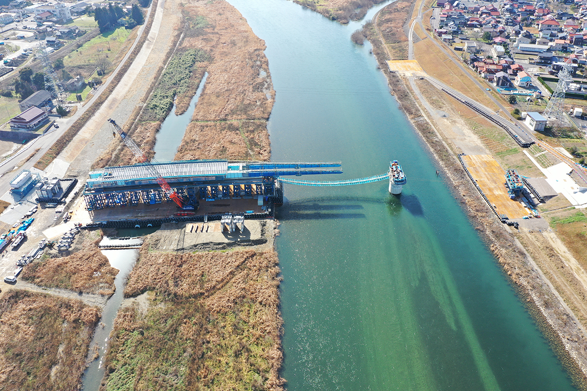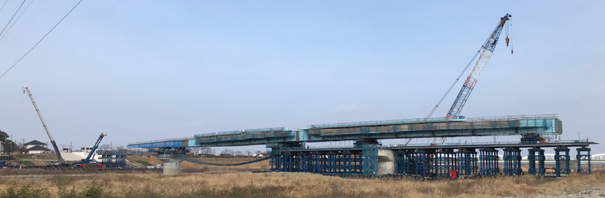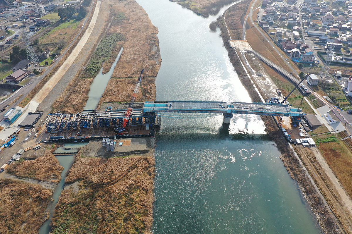 角 河川部は送出し架設、高水敷はクレーンベント工法を採用しています。送出し架設では、今年2月15日に桁が対岸(左岸側)のベントに到達しました。高水敷の架設については3月に完了しました。
