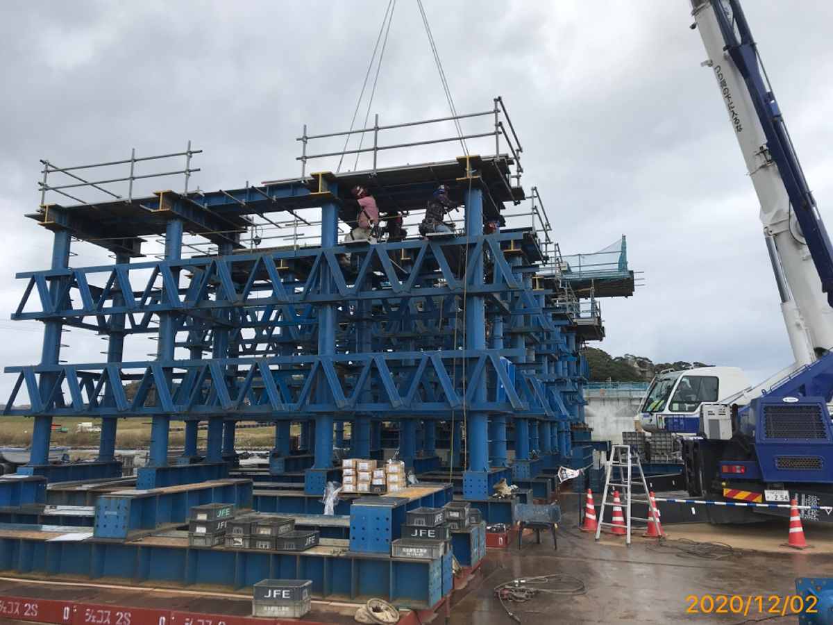 架設順についても、当初設計では右岸高水敷のクレーンベント架設をしてから送出しを行うことになっていましたが、それでは降下量が大きくなり時間がかかるため、施工者であるJFEエンジニアリングの提案で作業構台を構築して送出し架設を最初にすることにしました。