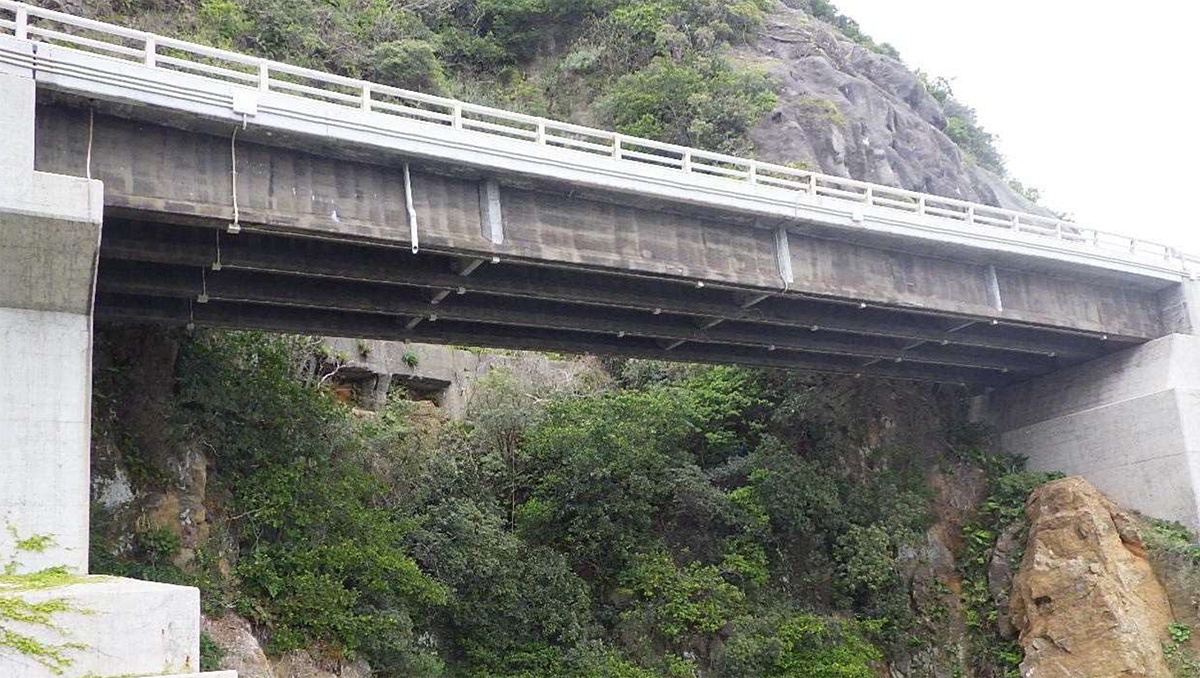 渡部 主要地方道大社日御碕線帆掛橋2号橋(橋長43m、ポストテンション方式PC単純T桁橋)で塩害が発生しています。同橋は島根半島西端の日本海に面し、橋梁の下がすぐに海という厳しい塩分飛来環境にあり、県内の塩害による損傷の極端な事例となります。