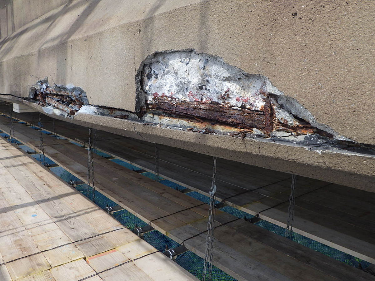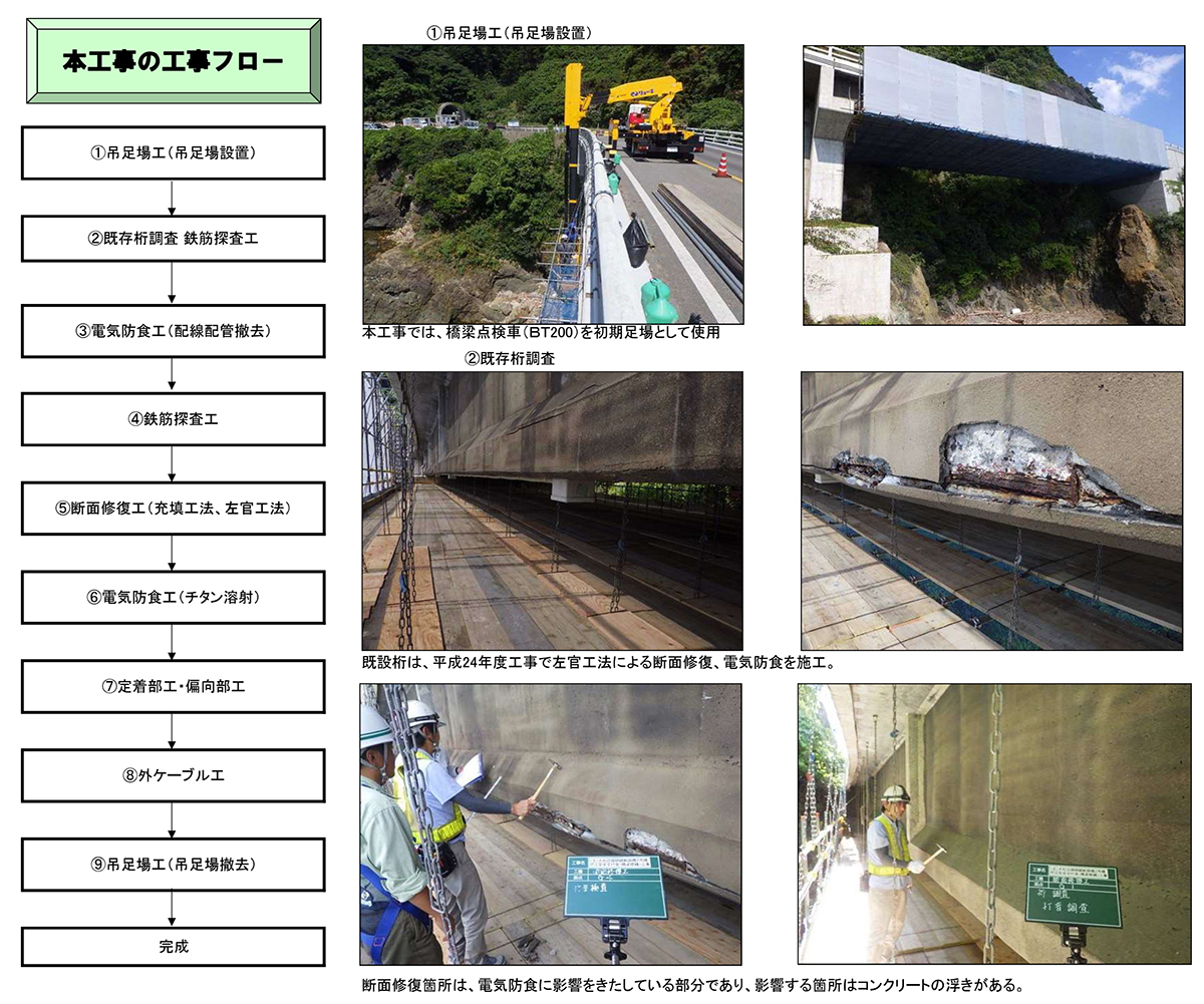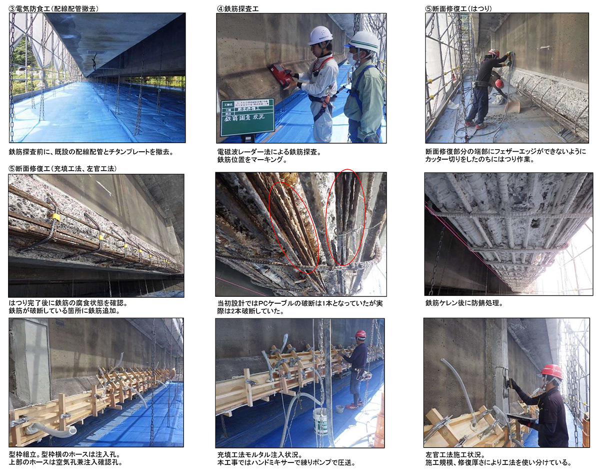 補修内容は、鉄筋探査を行った後、モルタル充填と左官工法による断面修復をして、チタン溶剤の電気防食(面状陽極方式)を実施しています。さらに、定着部に振止装置、偏向装置を設置して外ケーブル緊張を行います。