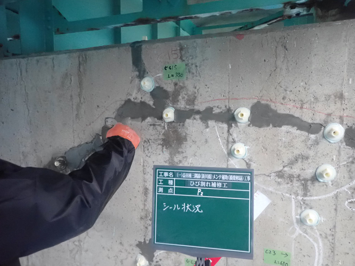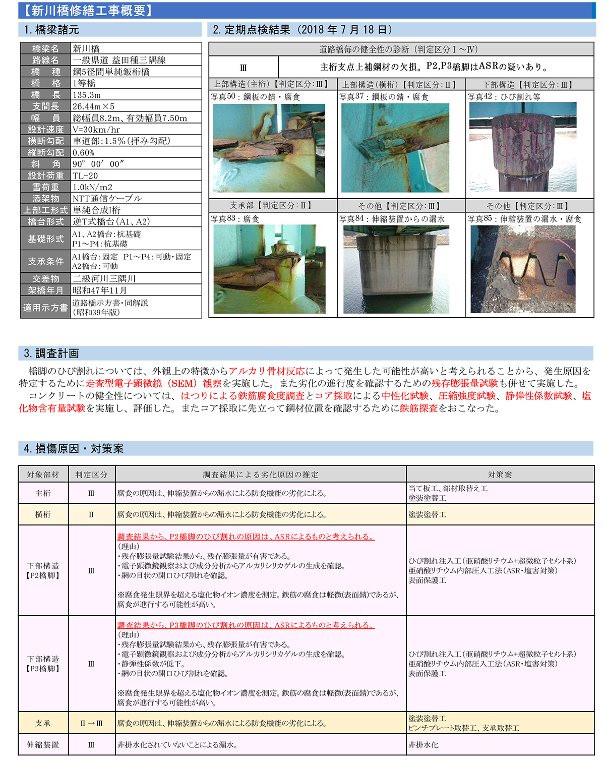 渡部 一般県道益田種三隅線新川橋(橋長135m、鋼5径間単純鈑桁橋)で確認されていて、P2橋脚とP3橋脚に亀甲状のひび割れが発生しています。対策としては、ひび割れ注入工、亜硝酸リチウム内部圧入工、表面保護工を実施し、本年4月に完了しました。