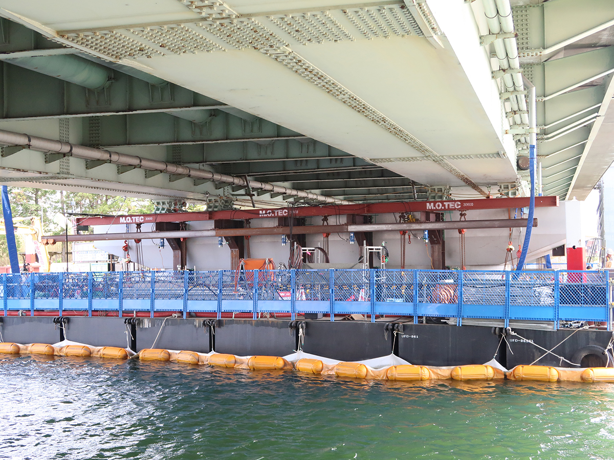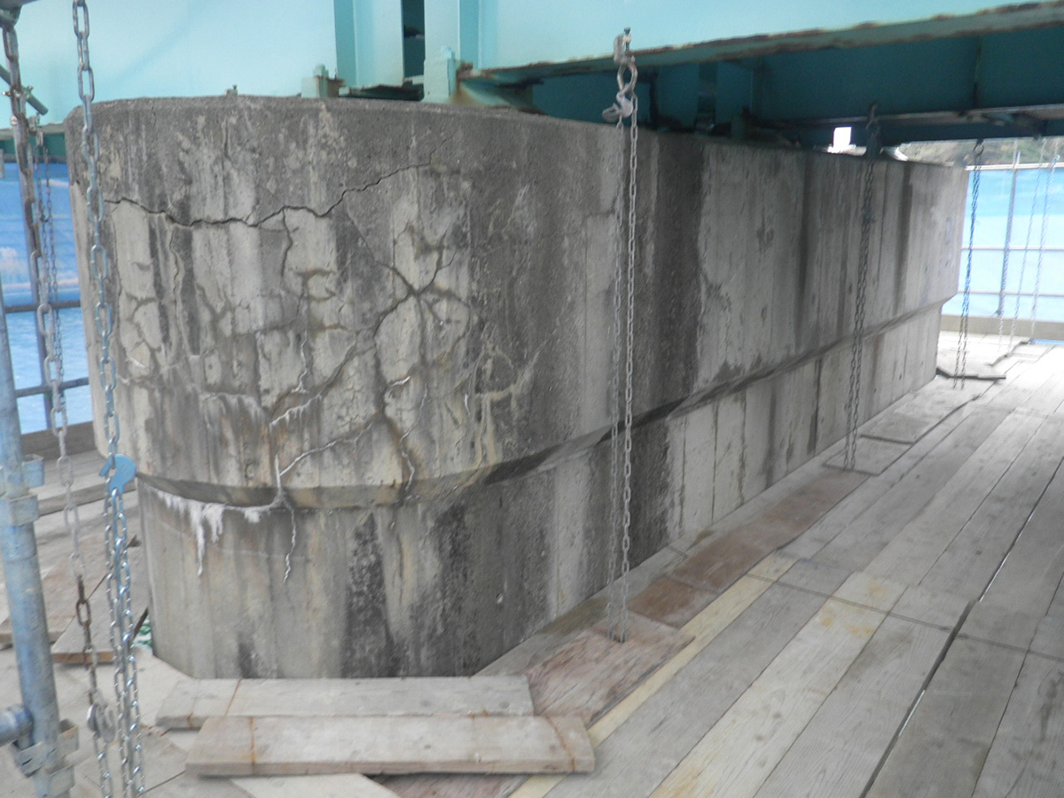 1977年の架設から約20年後に塩害が確認されて、表面被覆工などの塩害対策を行いました。その対策から15年後には、第2径間の主ケーブルの腐食、コンクリートの剥落、上下部工のASRの進行、下部工鉄筋の断面減少などの損傷が確認され、電気防食などの対策を実施してきましたが、対策実施中に第2径間の主ケーブル端部の破断など、想定を超えるような塩害の損傷が確認されました。その後、電気防食工と歪み観測を行いながら供用していましたが、2018年にはG4桁下端に大きなひび割れが確認されたため、耐荷力確認後、片側交互通行規制を行いながら、補修工事に着手しました。