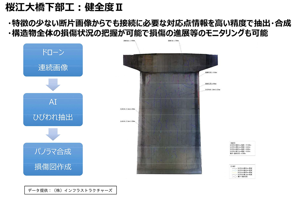 渡部 2019年度から点検と修繕の効率化に向けて、東北大学とインフラストラクチャーズ(東北大学工学研究科インフラ・マネジメント研究センターの研究開発から生まれたベンチャー会社)と島根県の三者で共同研究を進めています。ドローンなどを活用して対象物の画像を撮影し、それをAIで分析して、ひび割れの状況を把握する技術の開発となります。さらに、診断結果から過去の補修類似事例を抽出できるデータベースの検討も行っています。今年度は、ドローンの撮影画像とAIを組み合わせた診断を本格稼働させるための実証をする予定です。