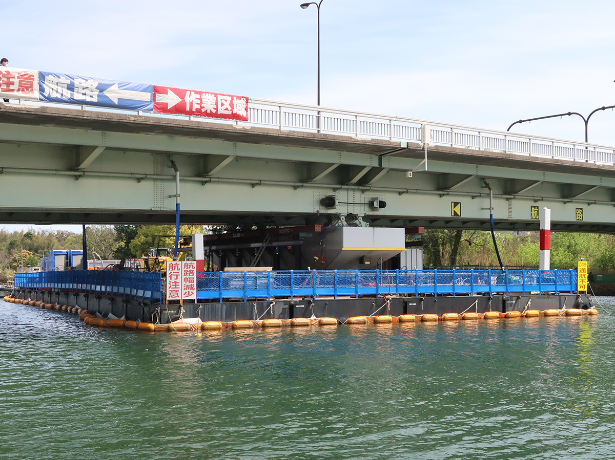 渡部 松江市内の大橋川に架かる主要地方道松江島根線くにびき大橋で耐震補強工事を実施しています。1981年に建設された橋長296mの単純鋼箱桁橋+3径間連続鋼箱桁橋+単純鋼箱桁橋+単純鋼鈑桁橋です。現在施工しているのはP1橋脚で、鋼板巻き立てと変位制限装置の設置を行います。P1橋脚以外は補強済みです。