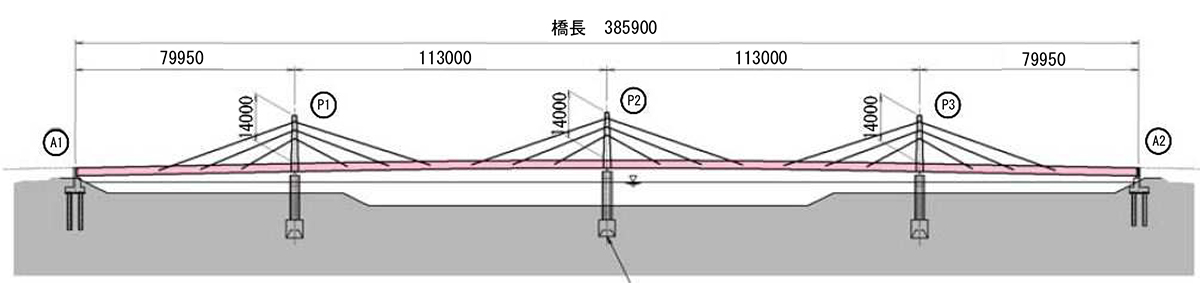 奥山 鋼4径間連続合成箱桁橋(ケーブル補剛)で、基礎は橋台が場所打ち杭、橋脚がニューマチックケーソン形式を採用しています。