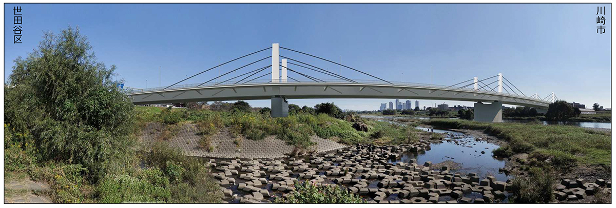 奥山 国分寺崖線(多摩川が10万年以上かけて武蔵野台地を削り取ってできたもので、豊かな自然環境が残る)という景観上に建設される条件から、その景観を損なわないよう(具体的には崖線の景観ラインを維持できるように)主塔高さを抑制する必要があり、河積阻害を最小限とするため、橋脚数を減らす必要がありました。そのため、斜張橋ではなく、橋脚と支承を介して分離する形式にする一方、吊形式かつ桁と主塔を剛結構造にすることで、主塔高(約17m)および桁高(2.9m程度)を抑制し、橋脚の数および規模のスリム化を図っています。