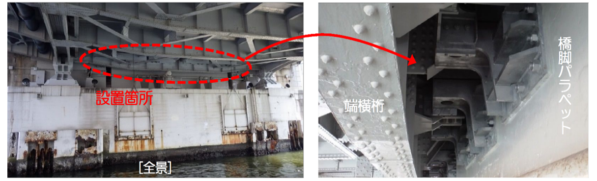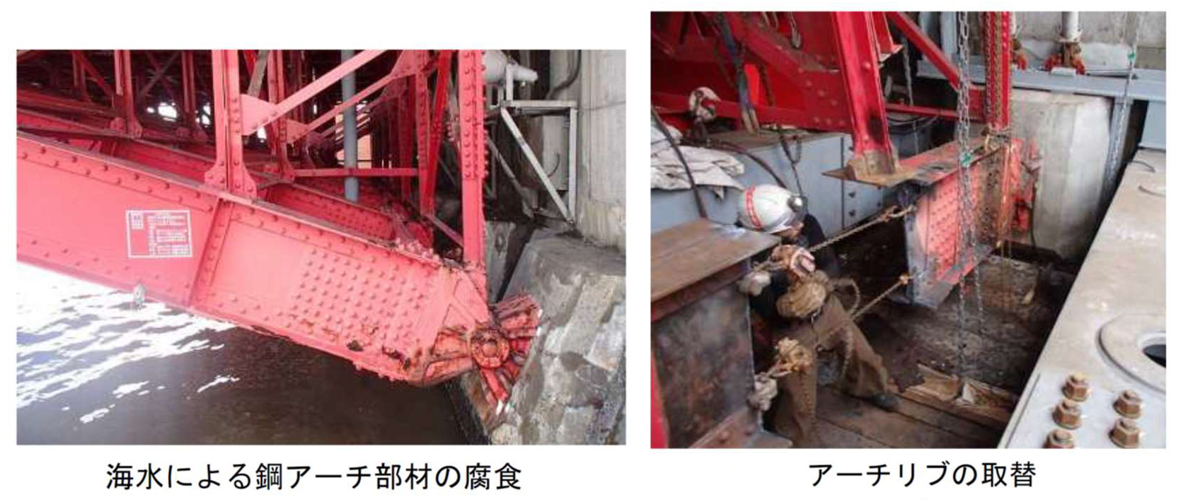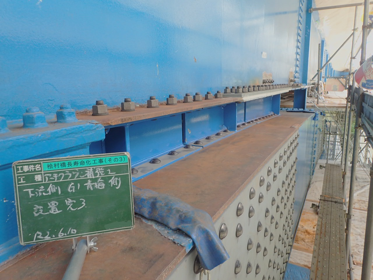 施工内容は、座屈拘束ブレースダンパーの設置および当て板併用による耐震補強のほか、アーチ中央支柱の補強を目的としたアーチリブ、補剛桁の開口部を鋼板による閉塞、アーチ沓上揚力対策としてアーチ横支材と橋座面とをPCケーブルで連結、補剛桁支承部の取替え、となっています。