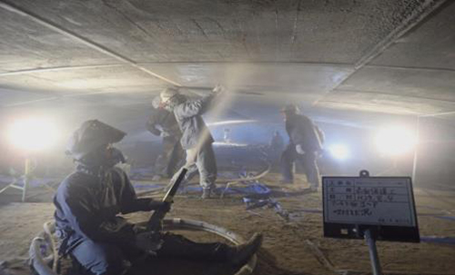 聖橋長寿命化事業。(右写真)ウォータージェットによるはつり後のアーチ部/(左写真)乾式モルタル吹付工による補修