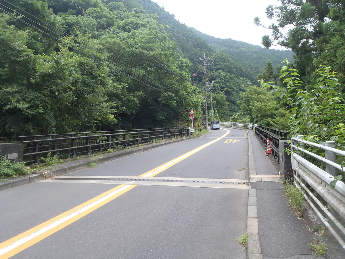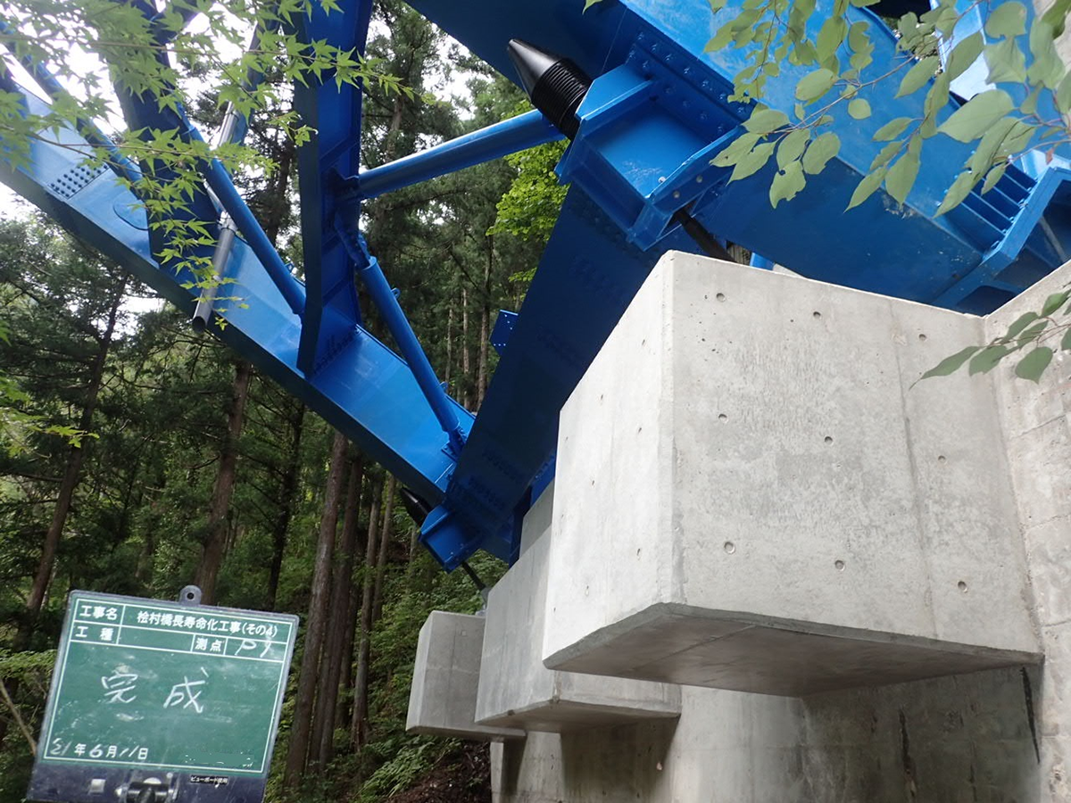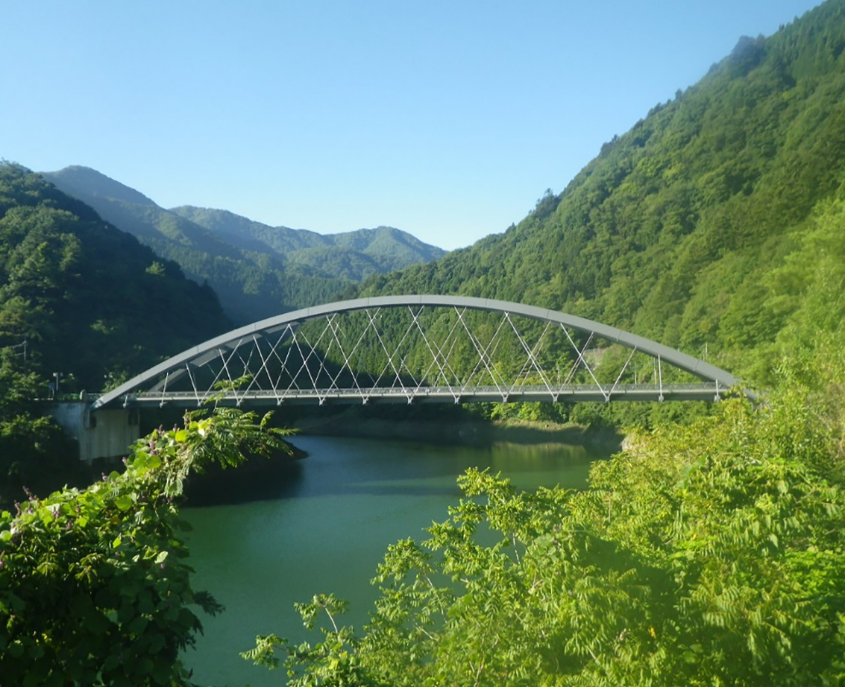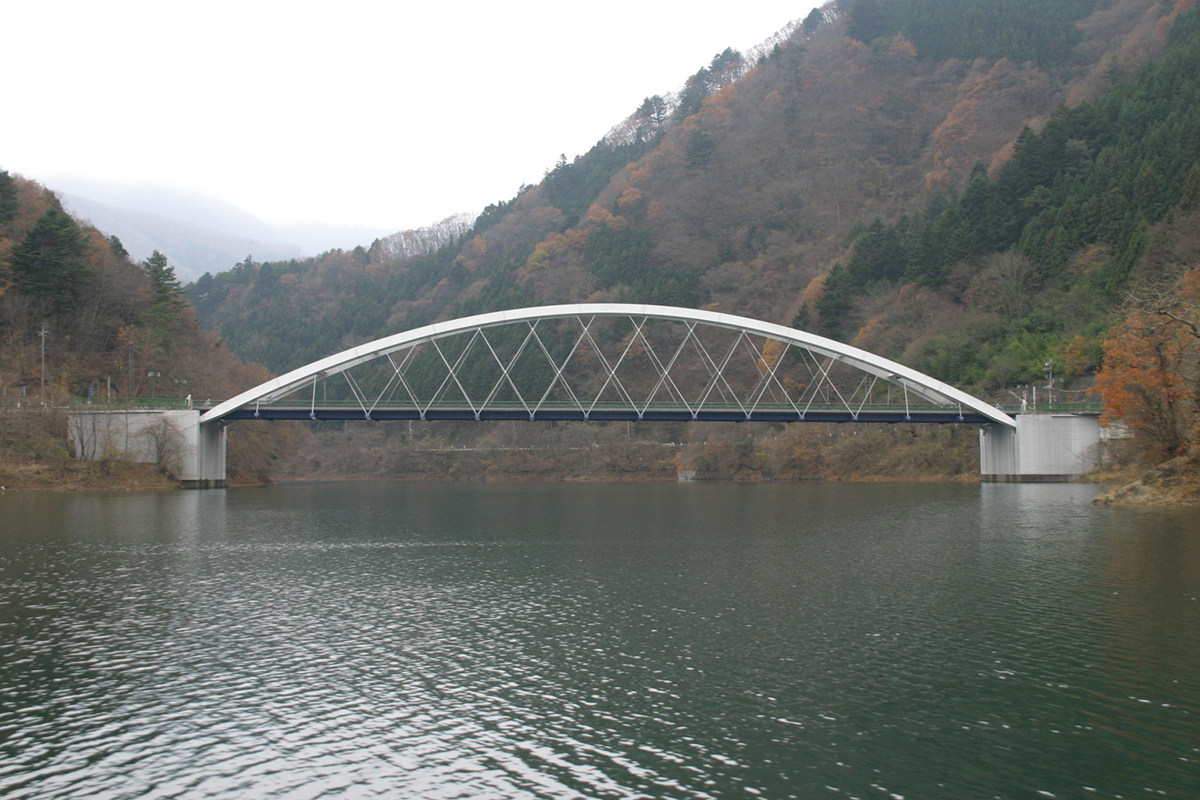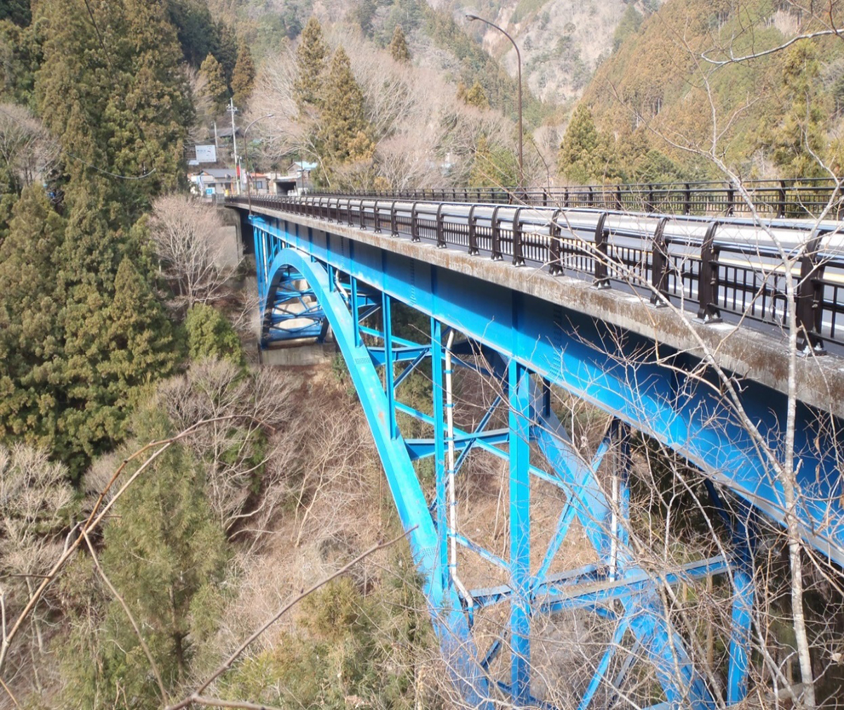 奥山 奥多摩町境にある桧村橋は橋長98mの鋼逆ローゼ上路式アーチ橋で、2019年度から耐震補強工事を行っていて、今年度完了しました。