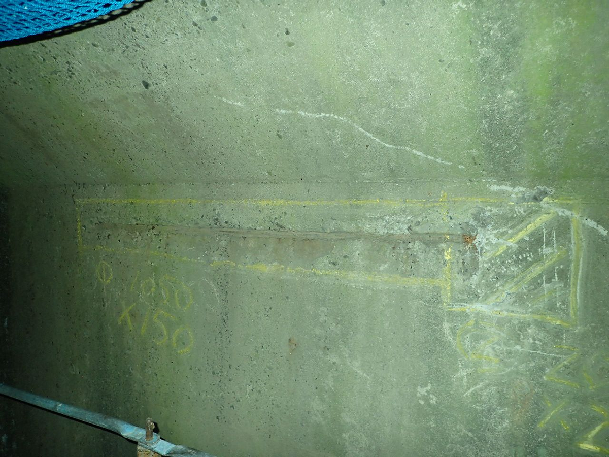 山間部の橋梁では、奥多摩町海沢にある綾瀬橋(第9次点検判定区分Ⅱ)があります。凍結防止剤に含まれる塩化カルシウムが橋面上から伸縮装置を通じて橋台に流出し、鉄筋腐食や被りコンクリートの剥落が発生しました。亜硝酸リチウム含有ポリマーセメントモルタルで断面修復工(左官工法)を行った後、亜硝酸リチウム系含浸材とケイ酸塩系含浸材を組み合わせた表面含浸工法(プロコンガードシステム)を用いて補修を行いました。