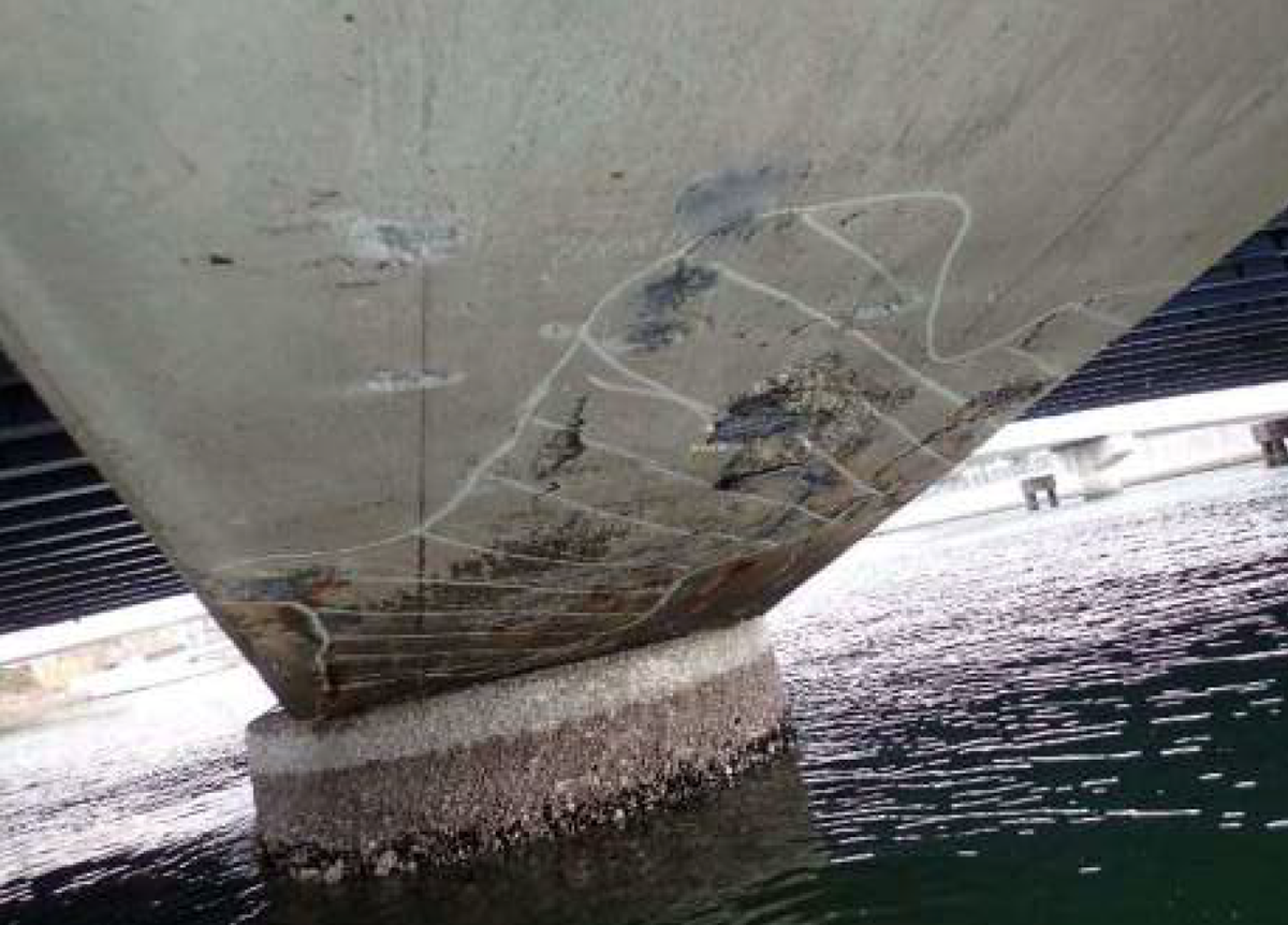 運河部の橋梁では、中央区勝どきから晴海に架かり朝潮運河を跨ぐ黎明橋(第9次点検判定区分Ⅱ)で、海風による飛来塩分の影響により橋脚梁部の鉄筋腐食や被りコンクリートの剥落が発生しています。同橋は主要幹線道路である晴海通りに架かっていることから、対策後100年間の延命化を目的とした対策を検討しています(長寿命化事業対象橋梁)。現段階では、ポリマーセメントモルタルによる断面修復工法を採用する予定です。また、橋脚内部の塩化物イオン濃度が高くなっていますので、亜硝酸リチウムを躯体に注入する対策も行う予定です。