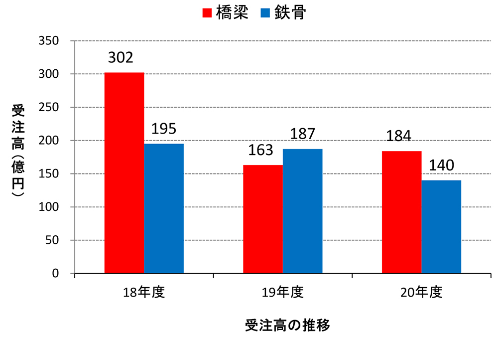 野上 売上高356億円、経常利益17億5,000万円、受注高は324億円だった。昨年度は受注競争の激化や海外ファブの参入増などで工場の山が低く、平均稼働率は80%を切る状態だった。ただ、そうした中でも各工事が止まることなくほぼ予定通りに進捗したこと、さらに橋梁分野でリニューアル工事の受注が堅調だったことなどで一定の業績を確保できた。受注の構成比率は鉄骨と橋梁がほぼ5対5となっている。
