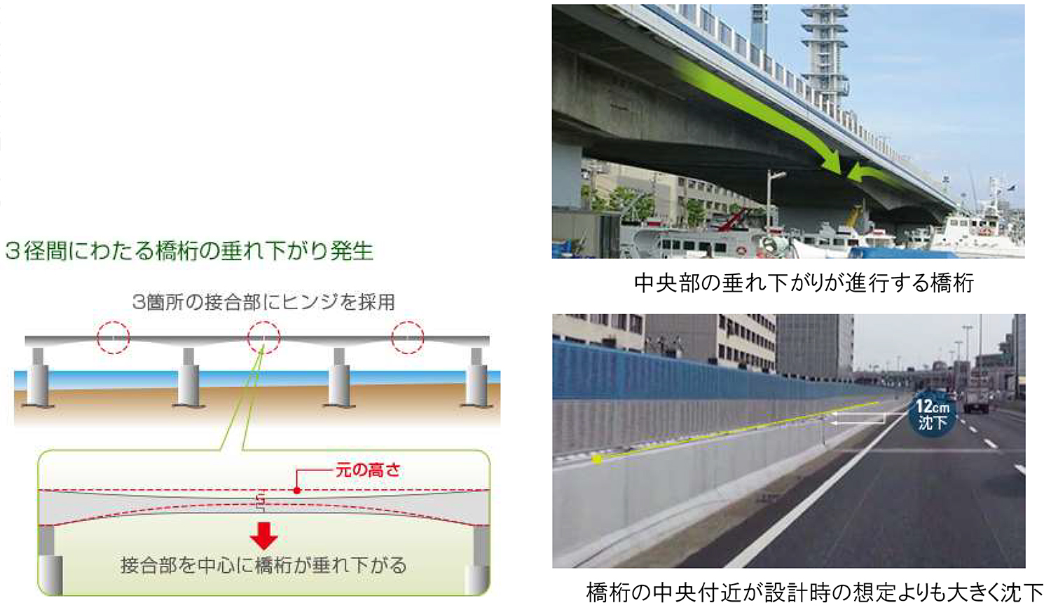 渡辺 既設橋は1966年に供用されました。設計示方書は鉄筋コンクリート道路橋示方書(昭和39年)となっています。支間中央部にヒンジを有するPC5径間ディビダーグ橋で、設計当初に想定した以上の沈下が進行したことから、1988年、箱桁内面に直線配置の外ケーブル補強を行いました。沈下進行のスピードは抑制されましたが、完全な抑止に至っていない(現状で沈下量は12cmに達する)ため、長期的な耐久性を維持することは難しいと考え、ディビダーグを取り替える方針で神戸市と協議を行っています。現場は船溜まりになっている個所ですので、海上保安庁の船や民間船の繋留がかなり多い箇所でもあります。そのあたり(船舶の移転)は港湾当局との協議も行わなくてはいけません。