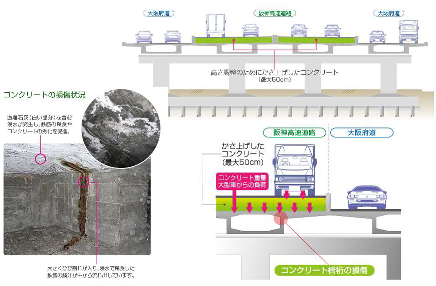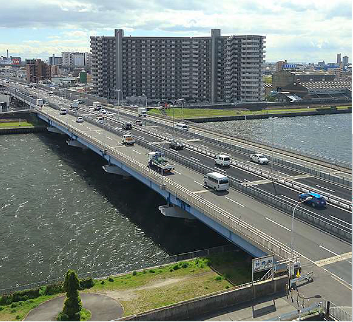 現在は詳細な調査に入っている状況です。ただ、神崎川渡河部の鋼ゲルバー橋は嵩上げがほとんどなく、大きな損傷もありません。一方、大豊橋の南側にPC桁区間があるのですが、そこで大きな嵩上げがあって、その影響が鋼桁の南の部分に少し出ています。PC桁の方も遊離石灰などは出ていますが、あまり激しい損傷は見られていません。架替えまでいかずに、長期耐久性を向上させる施策がないかということも検討しています。