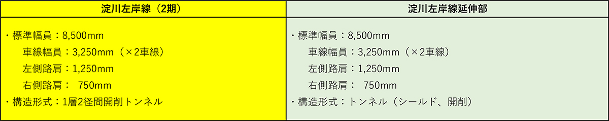 淀川左岸線(2期)の標準幅員は8.5m(車線幅員3.25m×2車線)で、1層2径間開削トンネルです。