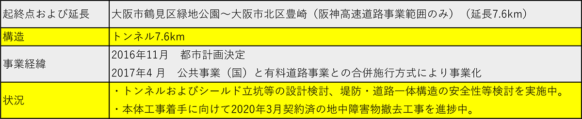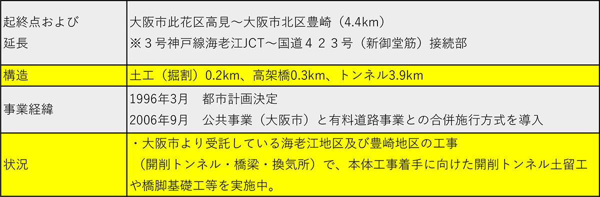 起点は大阪市此花区高見(3号神戸線海老江JCT)、終点は大阪市北区豊崎(国道423号(新御堂筋)接続部)となります。構造別では、トンネルが3.9kmと大部分を占め、高架橋0.3Km、土工(掘割)0.2kmとなります。