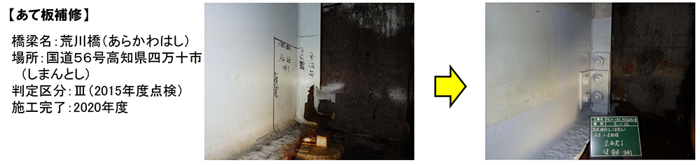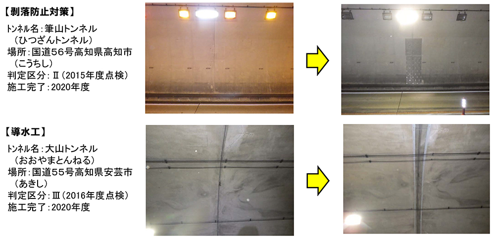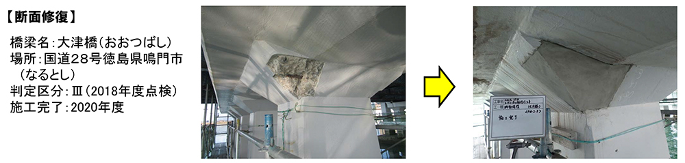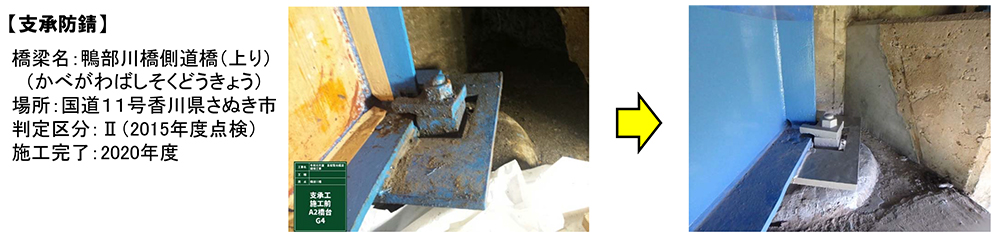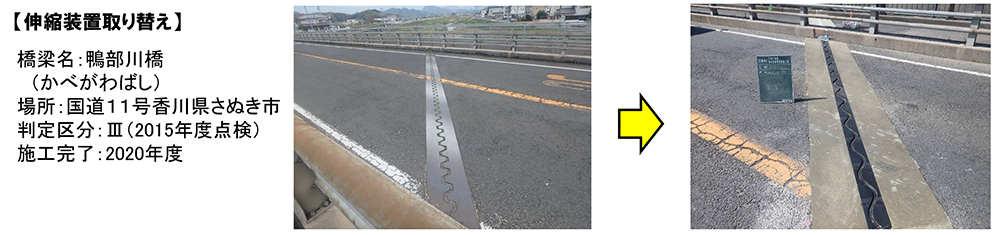 2020年度施工の主な事例では、国道32号福家高架橋(香川県高松市)で落橋防止装置の設置、橋脚巻立て、沓座拡幅、国道11号かちどき橋(徳島県徳島市)で変位制限装置の設置を実施しています。