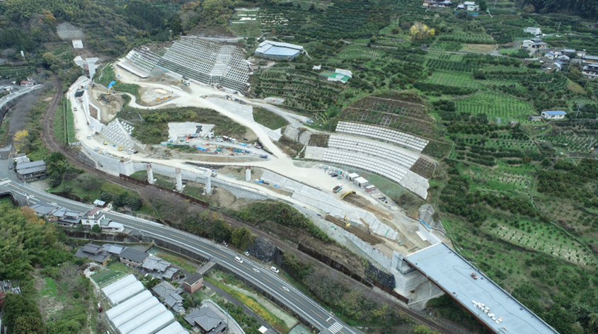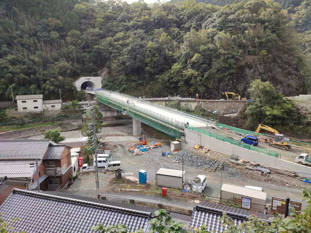 続く夜昼道路は、13年度に事業化し、現在、大洲平野と八幡浜東の両IC周辺から切土・法面工事や橋梁下部工事を進めています。