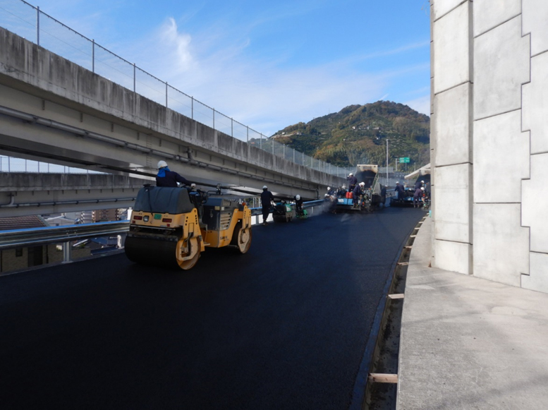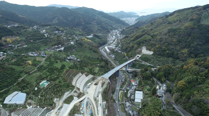 次に、八幡浜道路は、05年に事業化し、これまでに千丈・松柏の2つのトンネル工事や八幡浜IC部の橋梁工事を終え、現在、八幡浜東ICで郷高架橋(仮称)の橋面工事や国道197号の現道へ接続する道路の工事を、八幡浜ICで安全施設や舗装工事を行っているなど、今年度末の開通を目指し、整備を進めています。