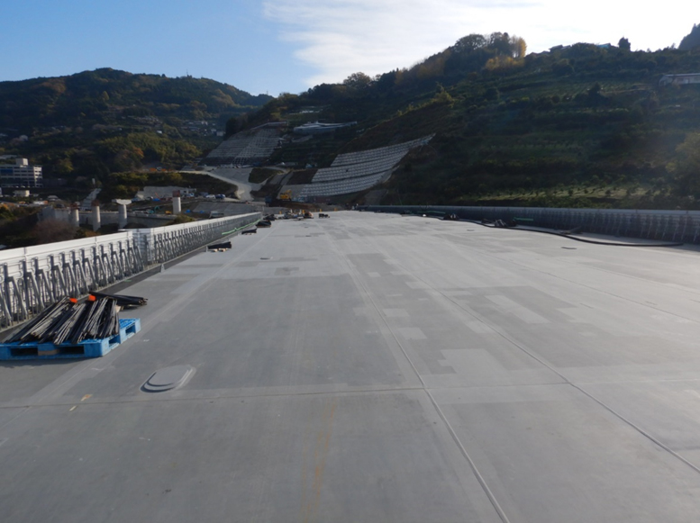 曽我部 八幡浜東ICにおいて郷高架橋(仮称)の上部工が施工中で、今年の10月に橋桁の架設を終え、現在、橋面工事を進めています。同橋は橋長200mの2径間連続鋼床版箱桁橋で、A1~P1(支間長135.5m)はJR予讃線を跨ぐことから架設をJR四国に委託し、P1~A2(支間長62.5m)の架設と橋面工を県が施工しています。鋼材は耐候性鋼材を使用しています。